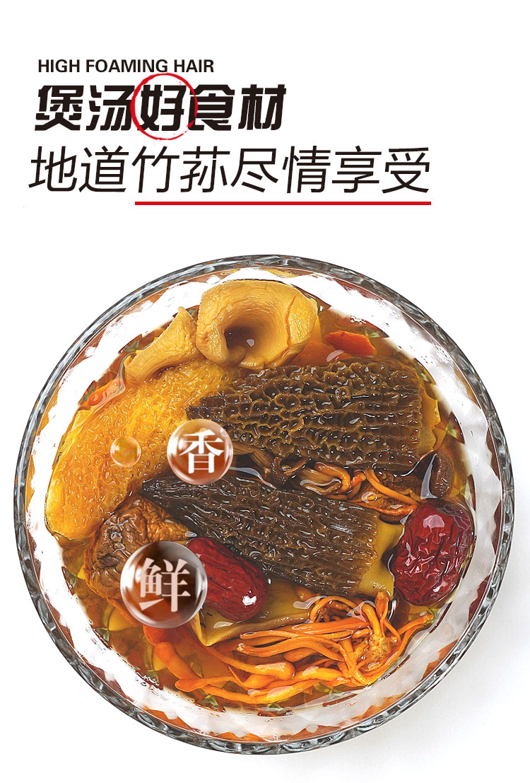 泡发后朵形好、菌帽完整,肉质厚实,口感脆爽,覆水率高,泡发之后会比较重,适合炖汤,超鲜美的。