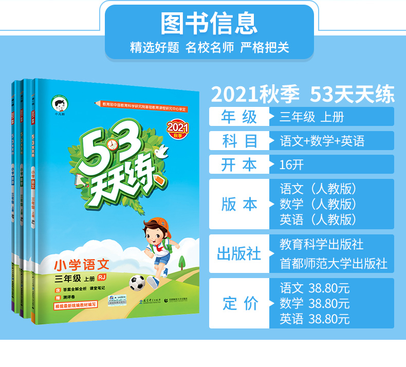 天猫南京彤诺图书专营店87.3元,可领29元优惠券,实付58.3元到手,小学三年级上册53天天练,语文+数学+英语,内容丰富,和课本同步,培养学生思考能力,增强应用意识,发展创新,掌握学习方法,让孩子赢在起跑线上!