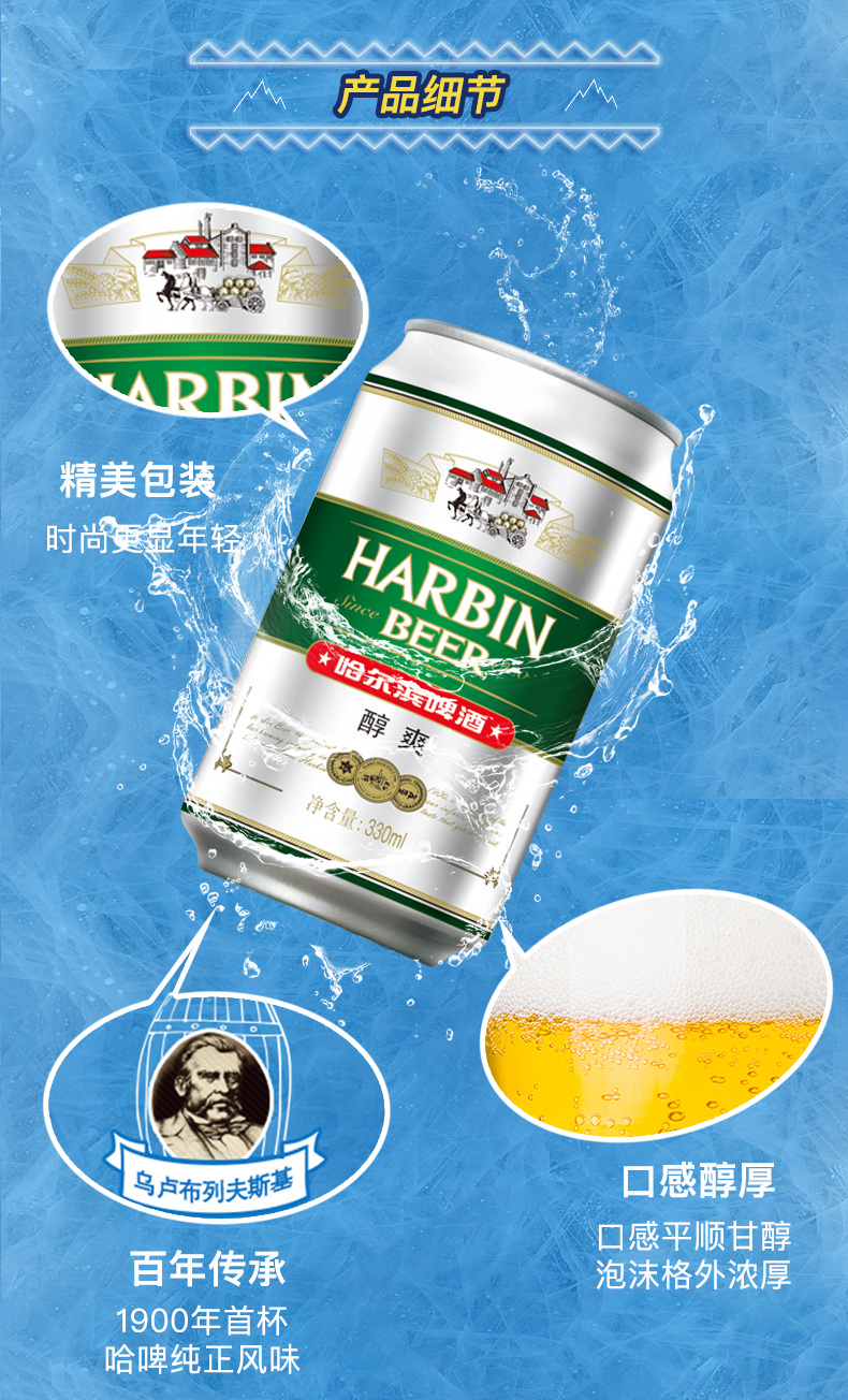 哈尔滨啤酒,诞生于1900年,由俄罗斯商人乌卢布列夫斯基创建。现在隶属百威英博啤酒集团旗下,是国内较早的啤酒品牌,拥有冰纯、小麦王、冰爽等系列产品。