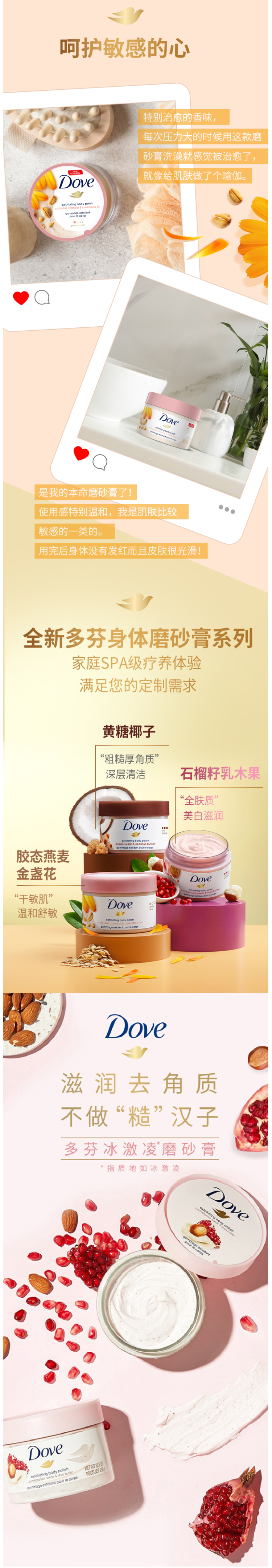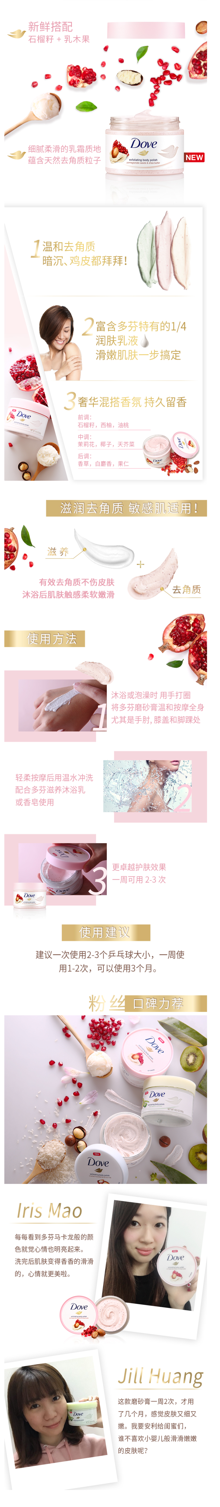 这款多芬Dove 石榴籽和乳木果冰淇凌身体乳,是新鲜石榴籽搭配乳木果,能够改善肌肤暗沉、深层滋润皮肤;细腻冰淇淋乳霜质地,触肤即化,不黏腻,同时果香四溢。