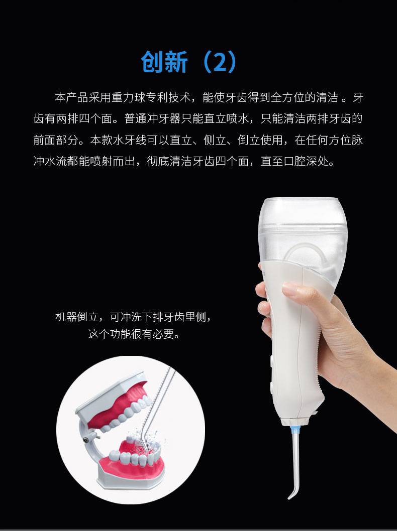 全面升级,日本万宝至马达,可拆卸式水箱,重力球设计,多角度使用,用水无残留。配有标准喷嘴*2、正畸喷嘴*1、牙周袋喷嘴*1、舌刮喷嘴*1.