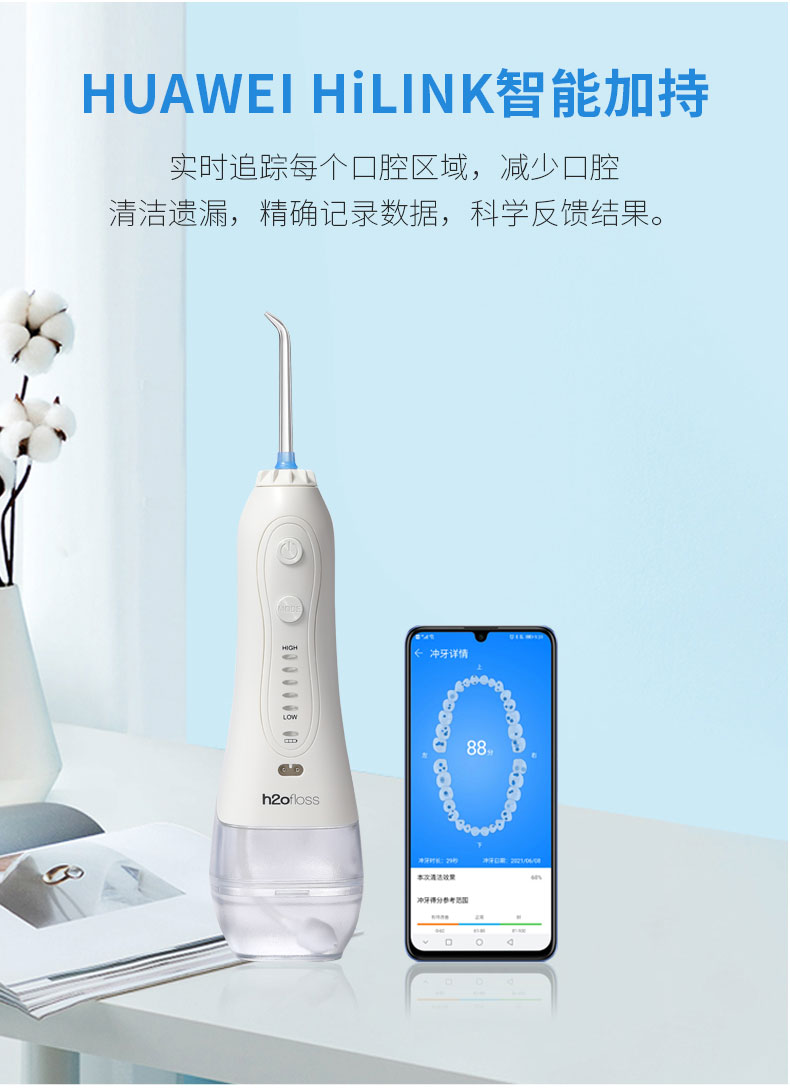 这款惠齿最新款抽拉冲牙器,支持华为智能APP连接,实时追踪每个洗牙区域,减少牙面的清洁遗漏,精确记录洗牙数据,得出洗牙洗牙效果评分。