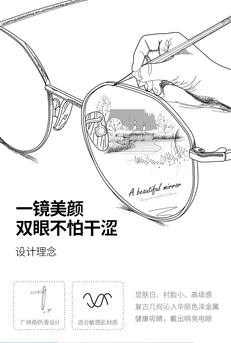 镜架有7°向内倾角,改变镜架在鼻梁上的重心点,防止眼镜框下滑。 弯折连接处开合自如不夹脸,软硅鼻托,减压无红印、支撑力度强。