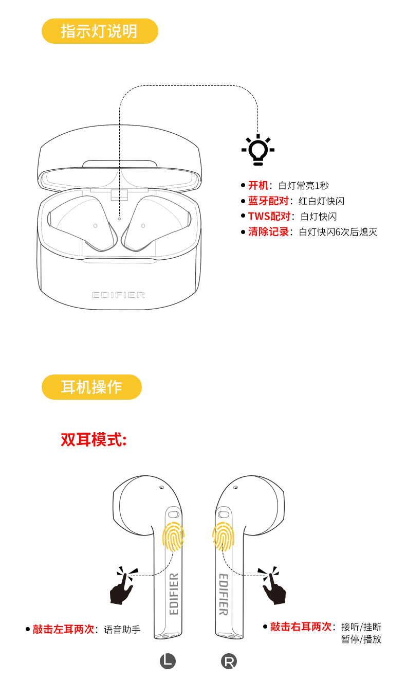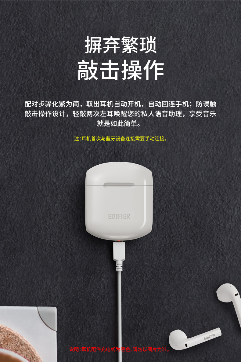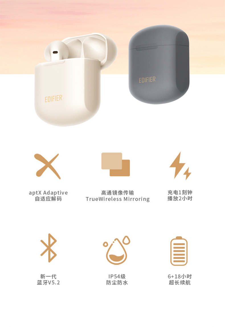 3D人体工学开模设计,曲面入耳,适合于绝大多数的耳型,单次续航6小时,耳机盒还能提供18小时的续航延长,无需担心电量问题,音质方面,使用生物振膜,结合漫步者多年的声学经验,三频均衡,还有IPX4级防水,可应对户外雨水和汗水的冲击。