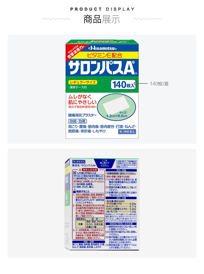 这款撒隆巴斯 复方水杨酸甲酯薄荷醇贴剂,日本进口,主要治疗肌肉疲劳和疼痛、腰酸背痛、关节扭伤痛,以及跌打风湿引起的各种疼痛等,效力能持续24小时,有效舒缓肌肉劳损及工作引起的各种痛症。