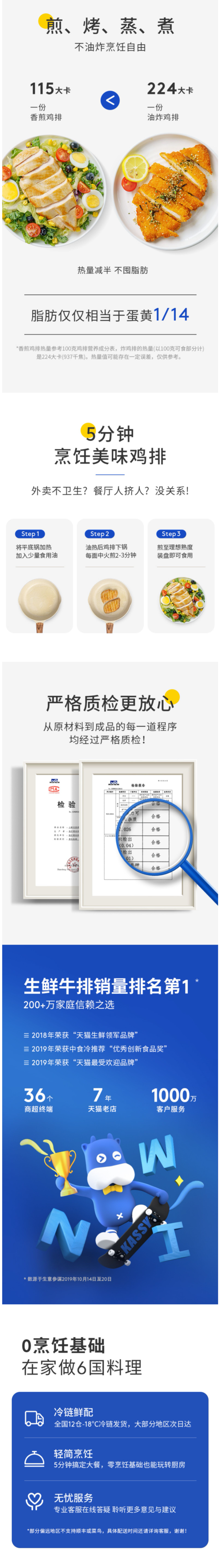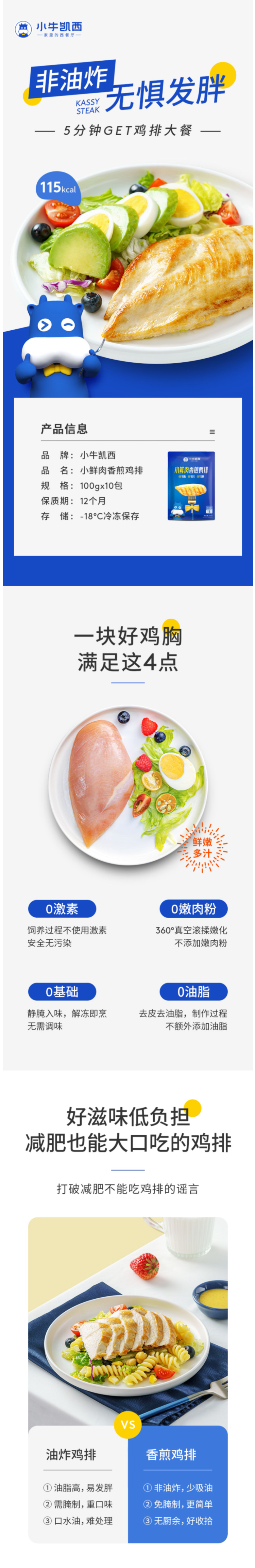 这款小牛凯西香煎鸡排是半成品,回家煎炸一下即可食用,无需再加任何调味。选取饲养过程中不使用激素的鸡,0激素成分,不添加嫩肉粉,去皮去油脂,制成过程中也不额外添加油脂,单片含1.9g低脂肪、16.9g高蛋白,7.2g低碳水,360°真空滚揉嫩化,独立包装。