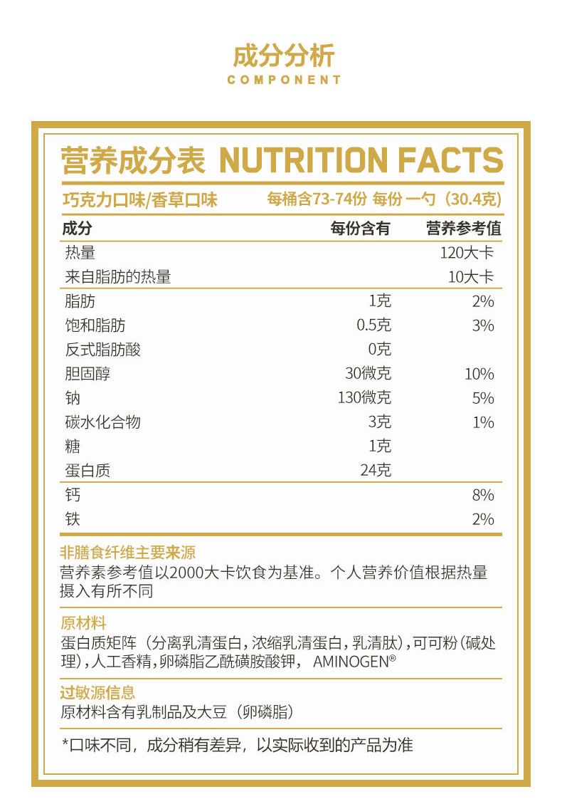 24g蛋白质:主要是为肌肉提供营养,高浓度蛋白质矩阵高达79%(其中蛋白质种类包含分离乳清蛋白,浓缩乳清蛋白,乳清肽),多种蛋白复合,营养充足;