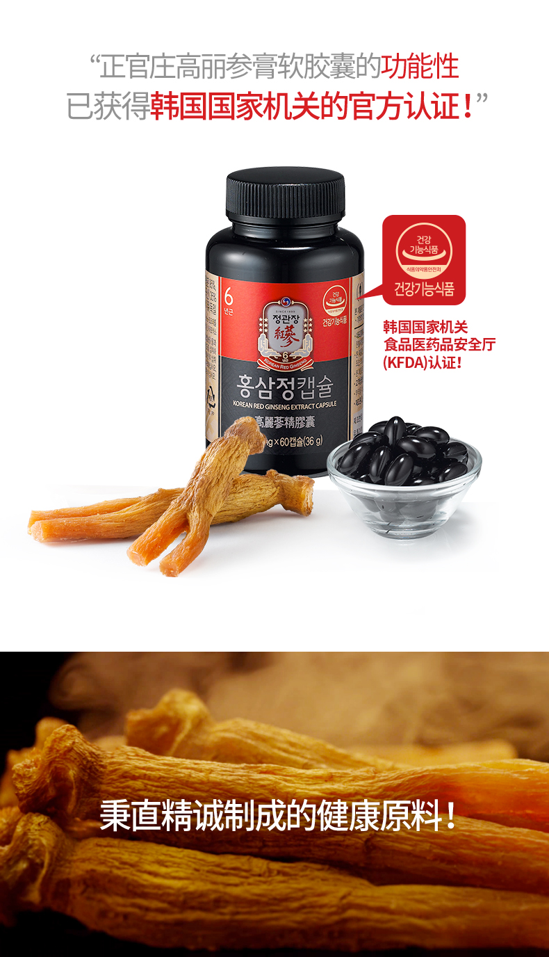 这款正官庄 6年根高丽参精浓缩液胶囊,以6年根高丽参为原材料(高丽参富含32种人参皂甙),配以葡萄籽油、卵磷脂、小麦胚芽油、小麦、大豆等副原料为辅料,以胶囊形制成,方便随时服用。