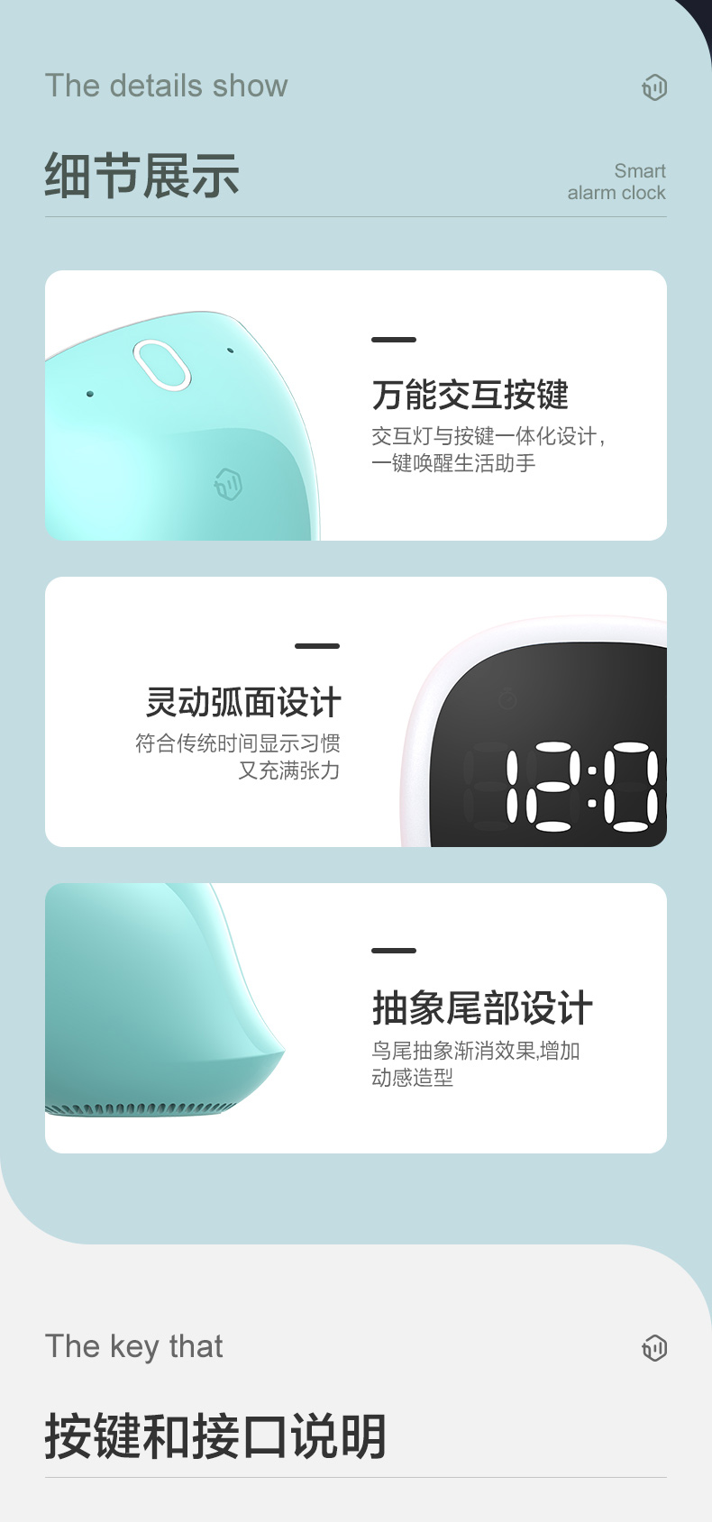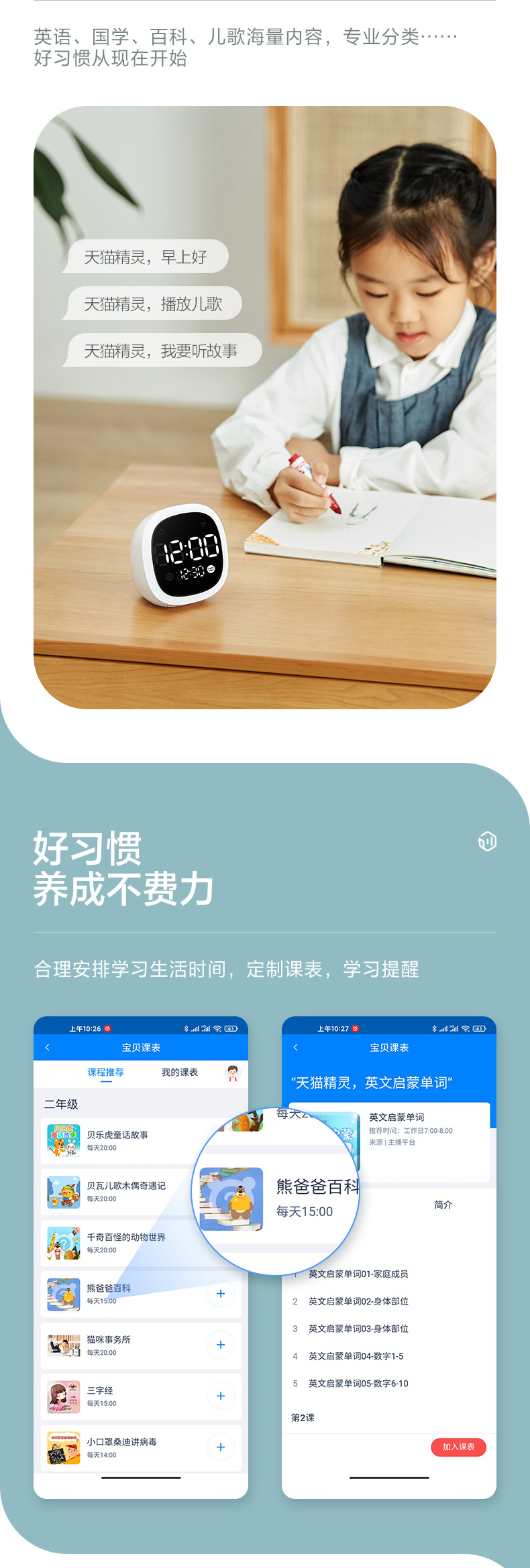 这款Timess 天猫精灵多功能智能闹钟,语音智能、学习熏陶、百组个性闹钟、内置天猫精灵、英语、国学、百科、儿歌、FC、习惯养成、时间管理、夜灯陪睡、按时提醒养成好习惯、定制课表、日程提醒、宝宝安心睡。伴睡夜灯、夜晚温馨守护、3档调节亮度,2700k色温,柔和亮光守护。天猫精灵,打开小夜灯、天猫精灵,小夜灯调亮。