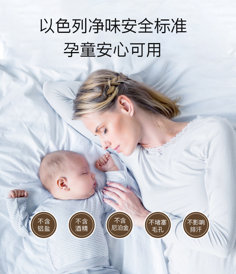 不含铝盐、酒精、尼铂金成分,相比市面98.2%含铝盐产品,不会导致腋下发黑,不会堵塞毛孔、不会抑制出汗、导致毒素沉积而危害身体健康。适用于包括孕妇、儿童、先天狐臭、汗臭等所有人群。