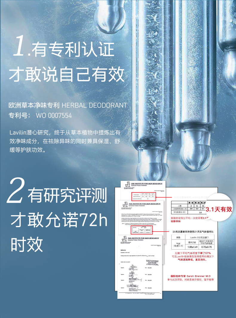 1.欧洲长效净味专利(WO 2007132439),常规净味产品的功效持续时间为2~3天,Lavilin净味配方时效可持续到5~7天。