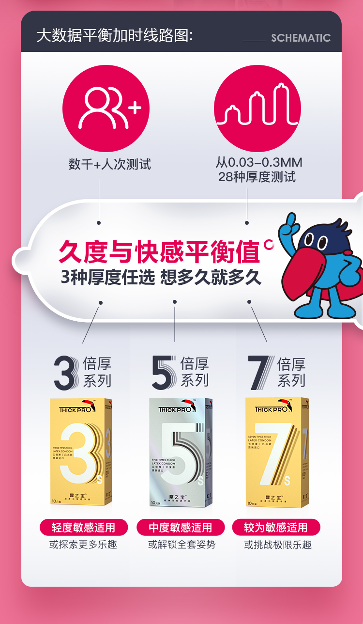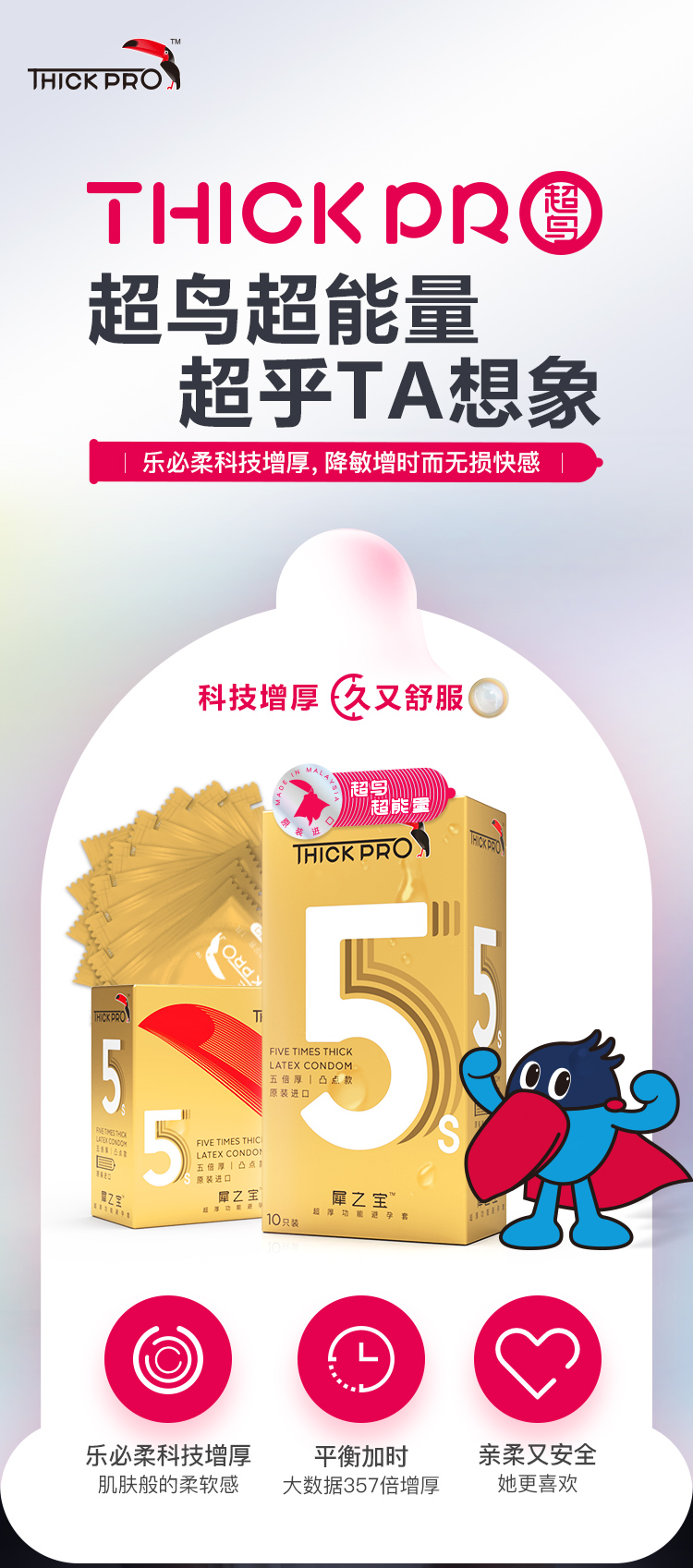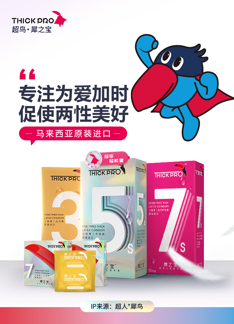 超鸟THICKPRO,是一款主打超厚功能避孕套的两性健康品牌,2013年开始产品研发筹划,历经7年,于2021年面世。联合马来西亚康乐(Karex)公司,经过3年多时间,研发出乐必柔生产工艺,借助原料优势和创新工艺使避孕套拥有柔软触感,使避孕套增厚又不损失快感。