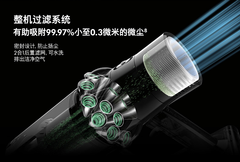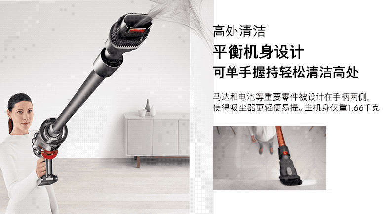 2.V10采用了全新设计的数码马达,特制的陶瓷轴承,它在将马达重量减至125g(V8是225g),使用起来更为轻便,且性能和不少有线吸尘器产品相比也毫不逊色。马达叶轮的的转速也达到了125000RPM (V8是108000RPM),相较V8在吸力上增幅了20%。