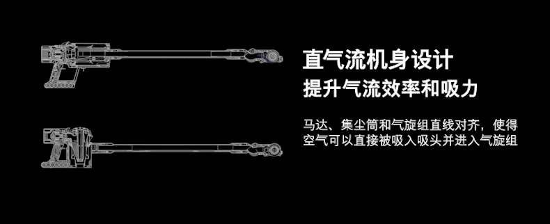 1.采用了全新设计的集尘桶,不同于以往的稍显累赘的手柄,产品将集尘桶由垂直式变为了水平式,保持吸头、吸杆和马达处于一条直线上,使得空气在主机内部更顺利流畅地进入气旋通道,提升气流效率的同时降低了噪音、也扩大了集尘桶的容量(比V8增加了40%)。