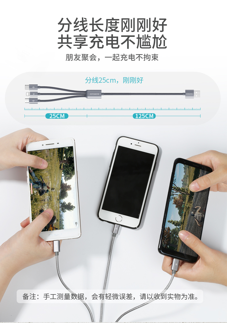 这款数据线为ROMOSS/罗马仕出品,带有Type-C、Lightning、Micro-USB三种充电接口,支持同时使用(需2.1A及以上电源支持,不可进行数据传输),足够目前市面上主流手机的充电需求,全铜线芯+铝合金外壳+尼龙编织线身更强韧。规格:分线部位长25cm,总长1米。