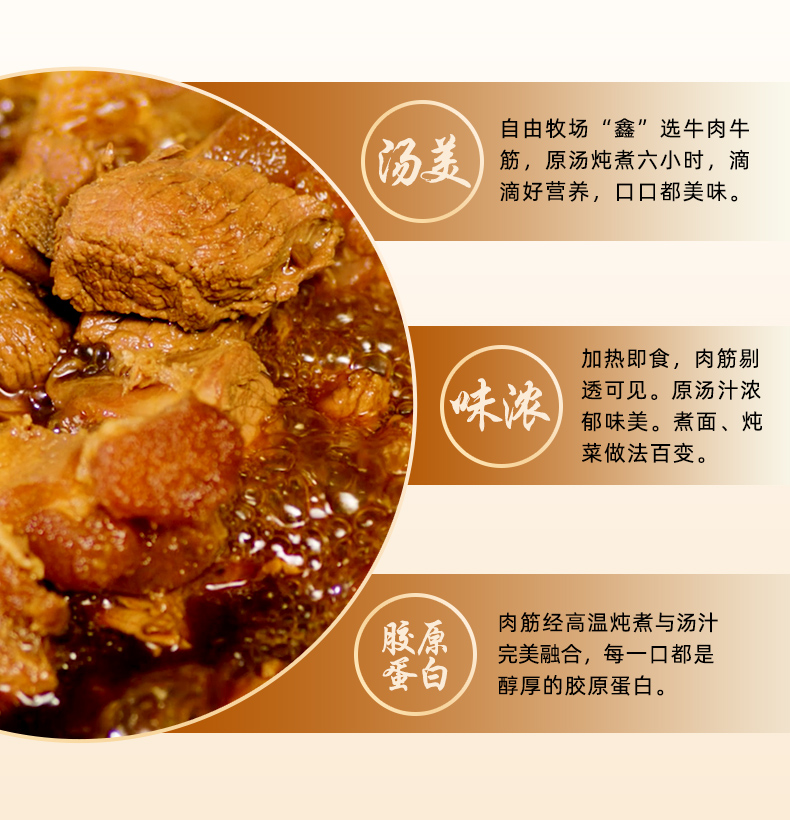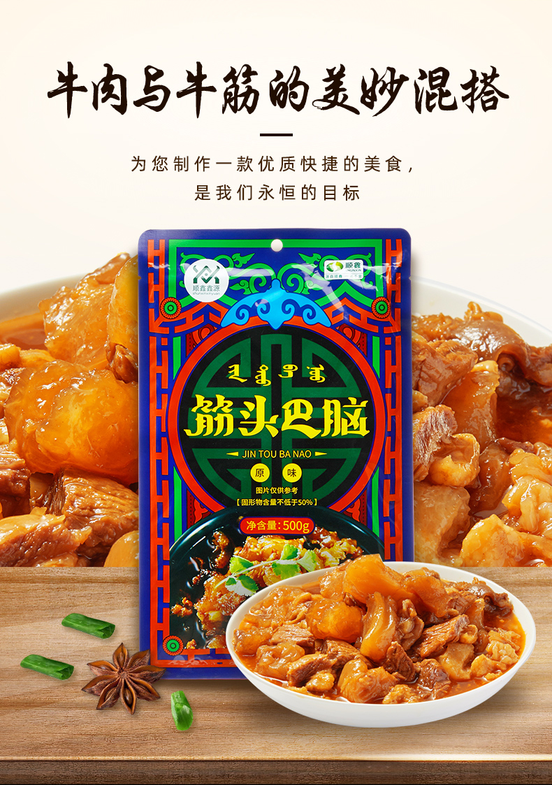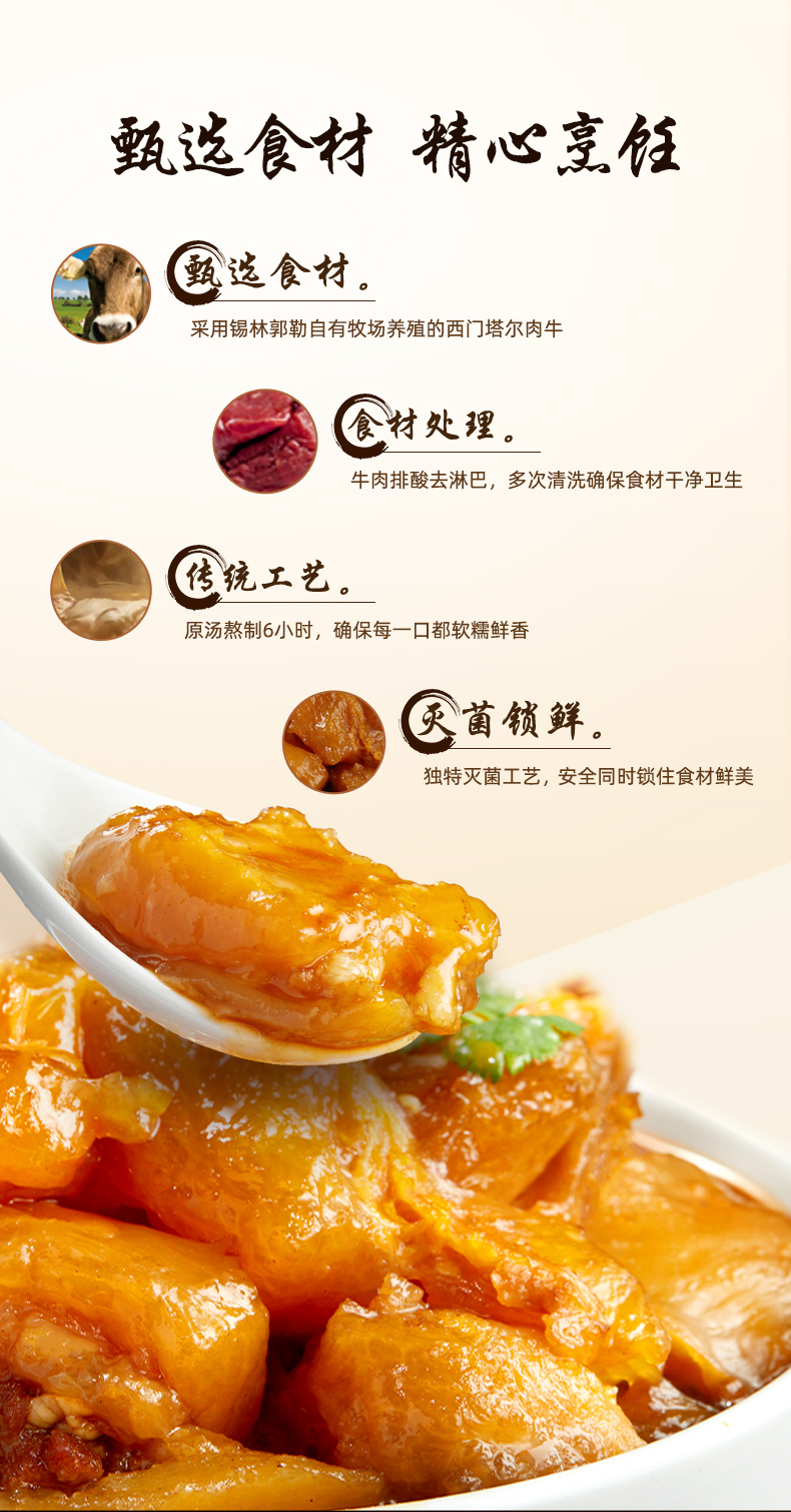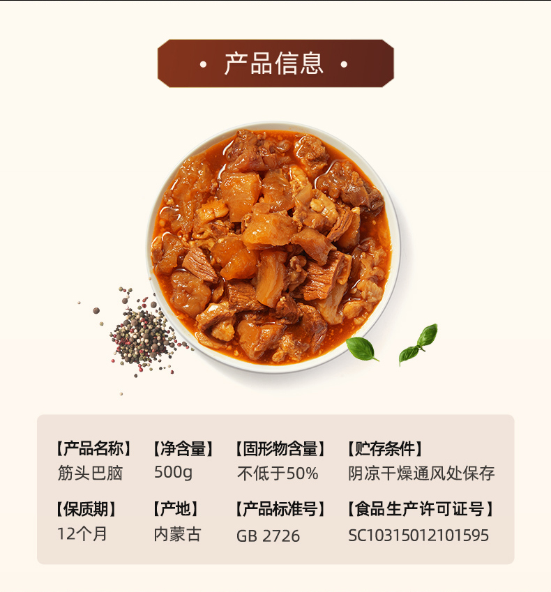 =59元 到手价,精选丰美牧场,自养好牛,牛肉与牛筋的美妙混搭,充分卤煮入味,肉质鲜嫩软烂适中,入口弹牙,无防腐剂、无添加剂,规格是500g*3袋。固形物含量50%以上,到手配蔬菜炖一下就是简单又美味的一餐。
