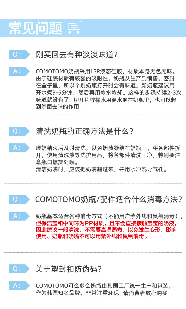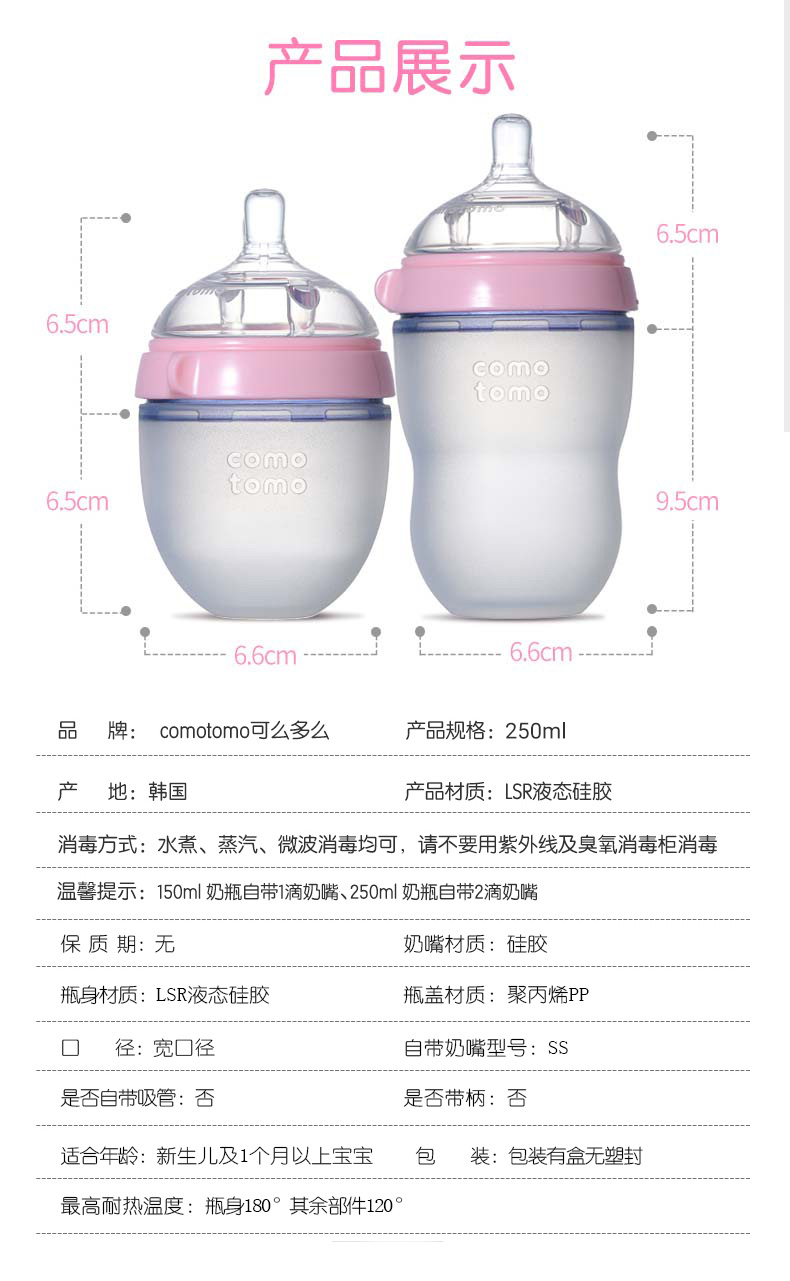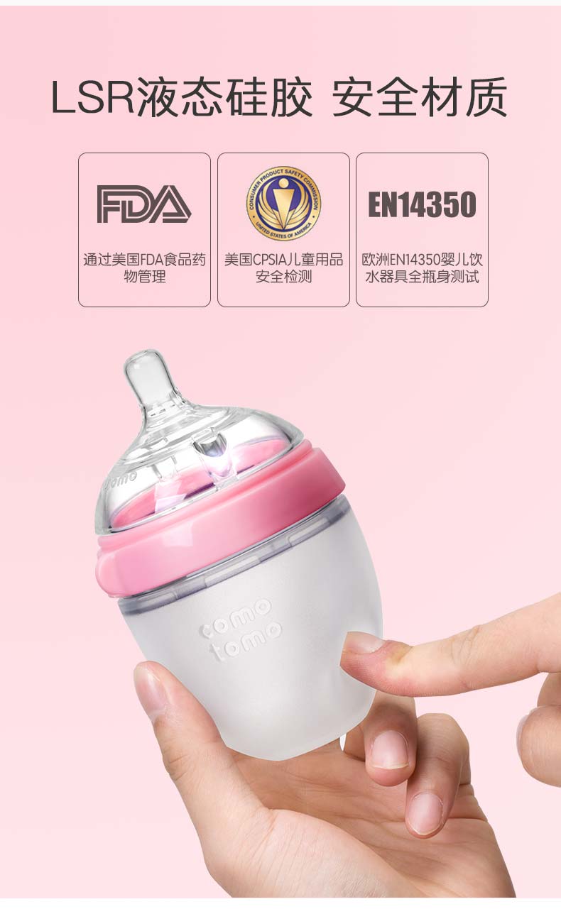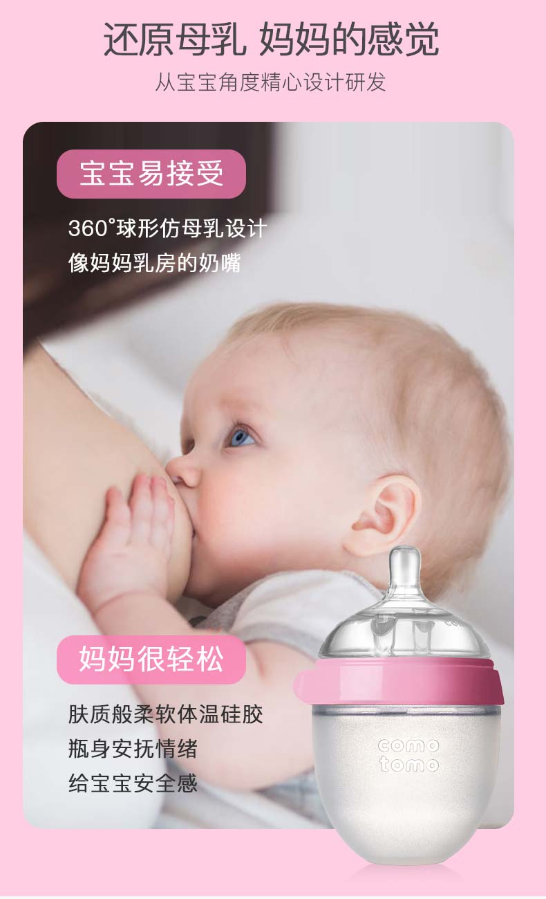 Comotomo是美亚长期销量第一的奶瓶,评论多反馈宝宝喜欢这种柔软的硅胶质地,这对喂奶有很大的帮助;且方便清洗,省时省力;医用硅胶质地,安全放心。