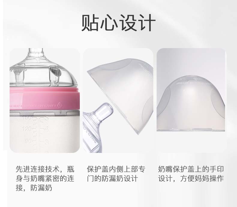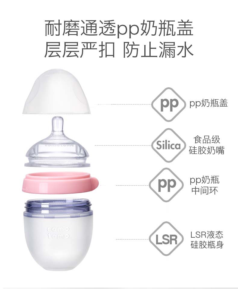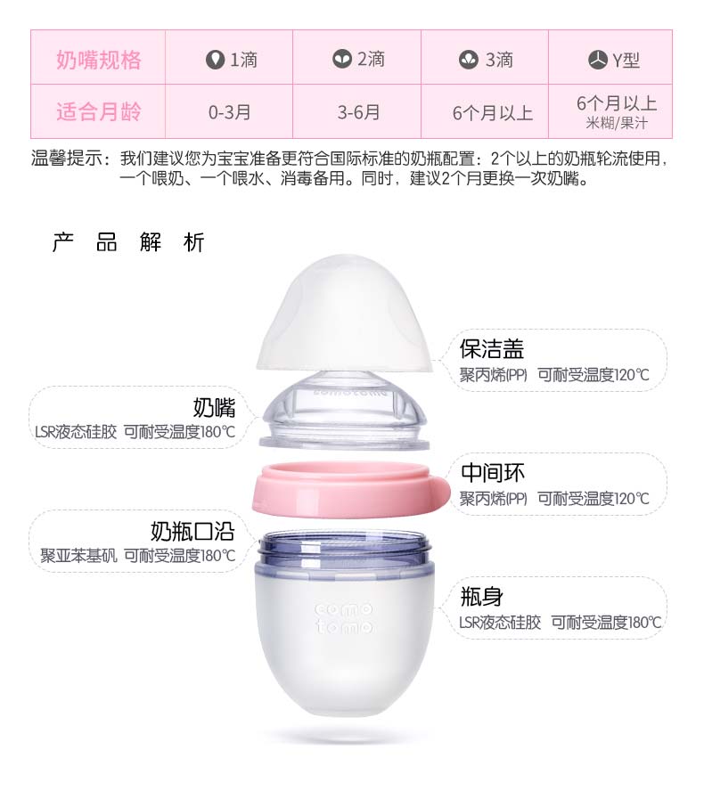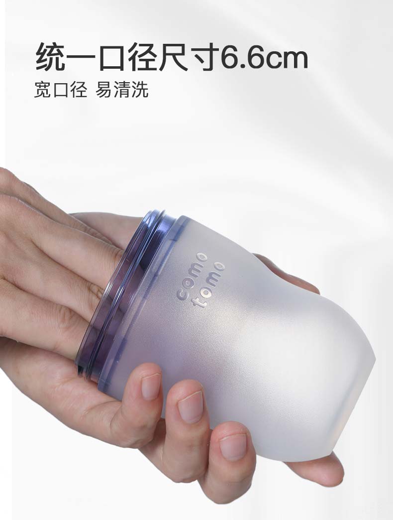Comotomo的瓶身、奶嘴均采用高级医疗硅胶材质,不含双酚A,触感极像真人肌肤,给宝宝安全感,6.6cm宽口设计,冲泡时以及清洗起来更加方便。独特的进气孔设计,避免让宝宝吸入过多空气引起胀气。瓶身与瓶口连接处采用专利技术,方便组装,不易漏奶。