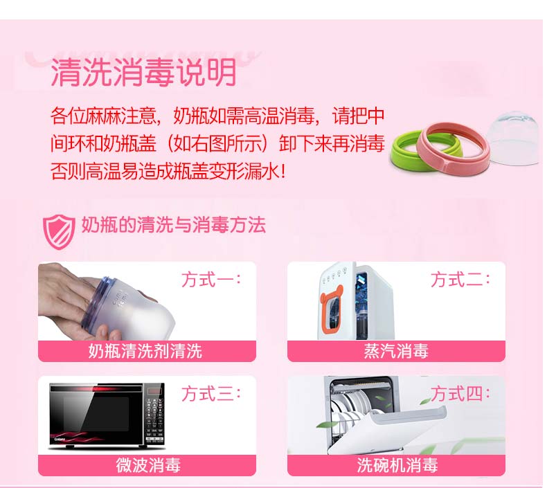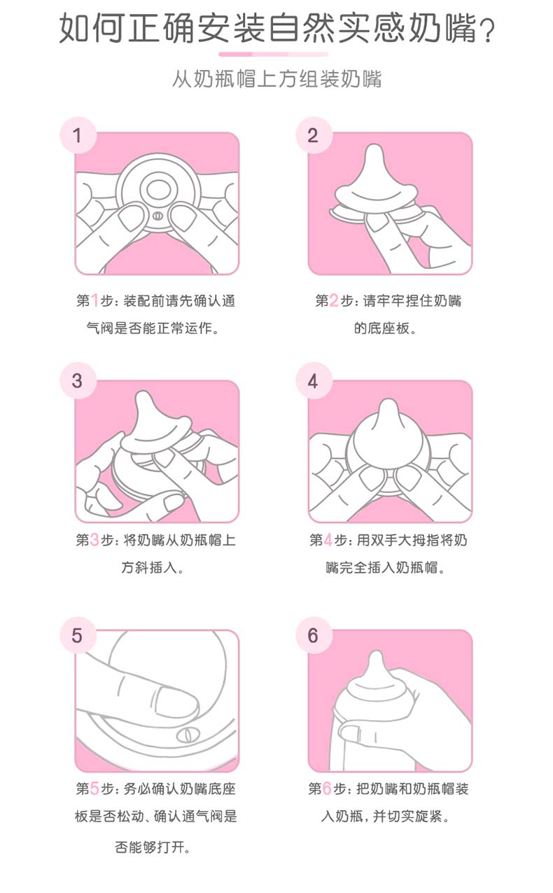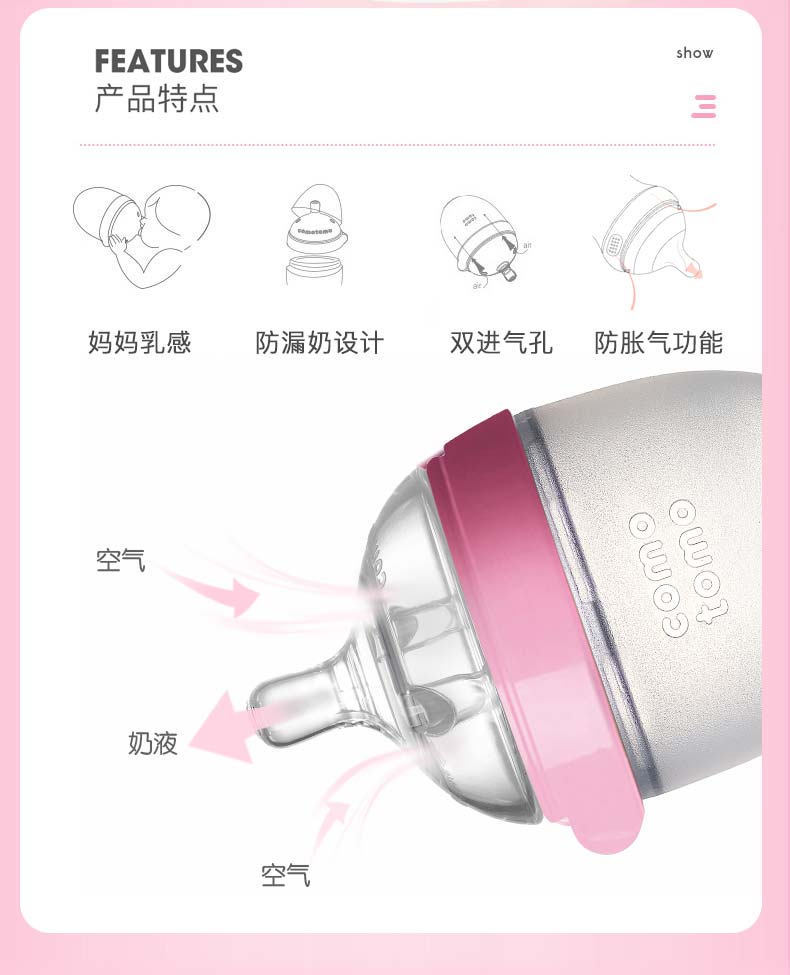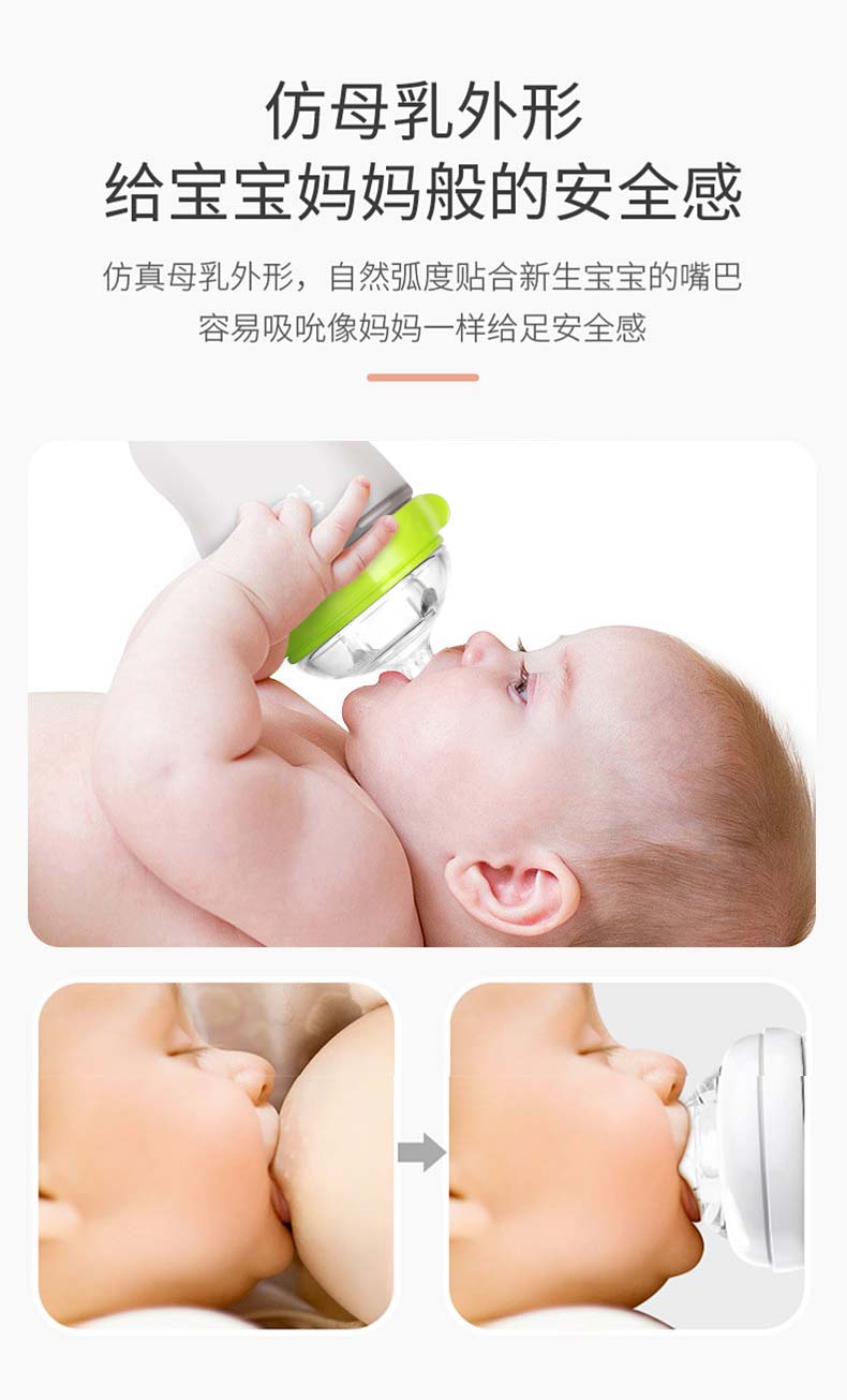 Comotomo的瓶身、奶嘴均采用高级医疗硅胶材质,不含双酚A,触感极像真人肌肤,给宝宝安全感,6.6cm宽口设计,冲泡时以及清洗起来更加方便。独特的进气孔设计,避免让宝宝吸入过多空气引起胀气。瓶身与瓶口连接处采用专利技术,方便组装,不易漏奶。