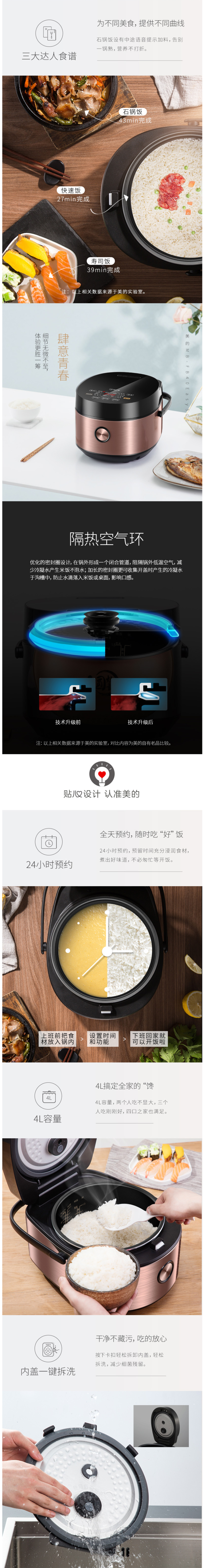 这款美的 全智能多功能电饭煲,容量是4L,适合3~7口之家使用。 拥有沸腾芯,阶梯式结构高效破泡防溢,可以保持持久沸腾不溢出,让米粒充分受热。同时0.3Kpa的为微压,使得煮出来的米饭味道更香。