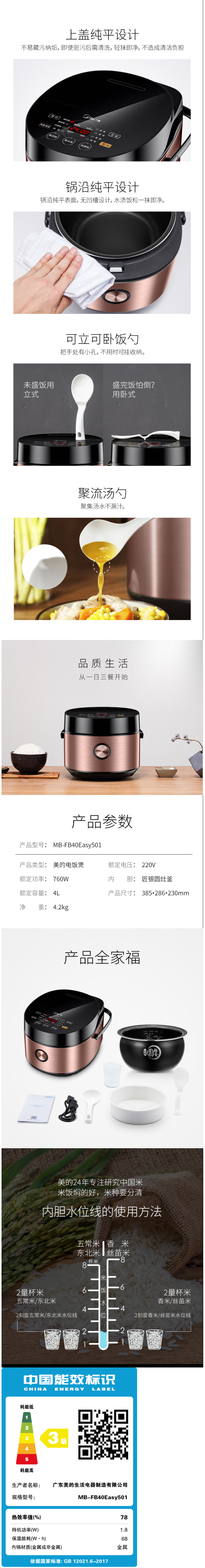 锅盖面触屏按键操作,看着很高大上,一抹即净。锅沿纯平表面,无凹槽设计,易于清理。可立可卧饭勺。
