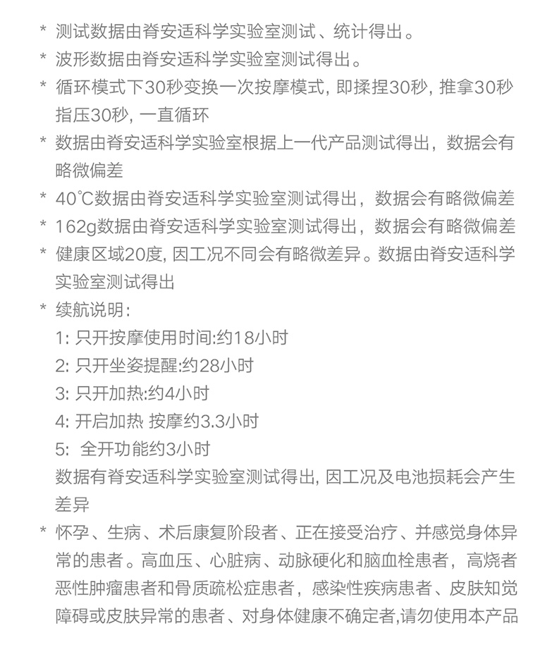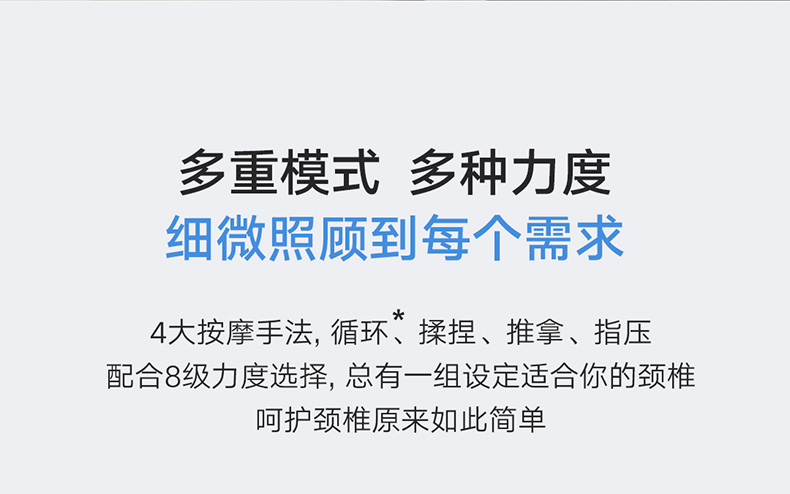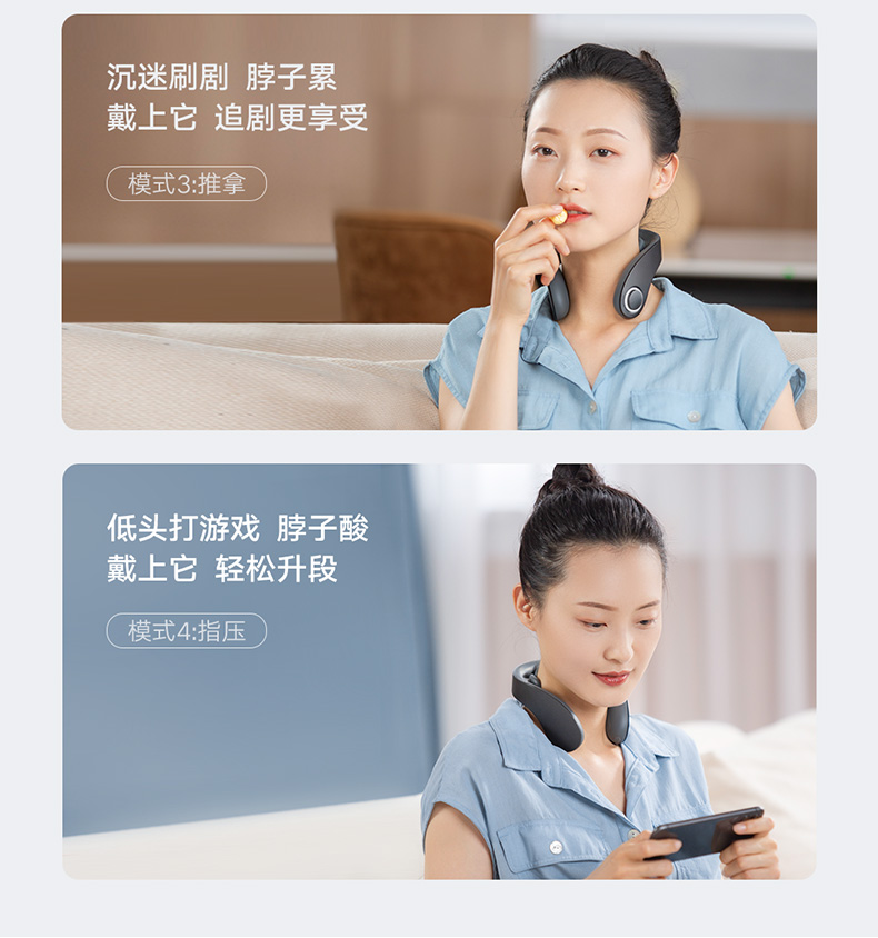 采用3个浮动按摩头,包裹式按摩贴合无间隙,L型垂挂设计,佩戴舒适不惧晃动。仿真脉冲按摩,模拟揉捏、推拿、指压四种按摩手法,8级力度可调,40℃双效热敷,促进血液循环、缓解疲劳疼痛。还增加了智能坐姿提醒功能,内置多轴陀螺仪,低头超过20°健康区域时,设备会发出振动提醒,时刻提醒端正坐姿。改掉不良习惯。
