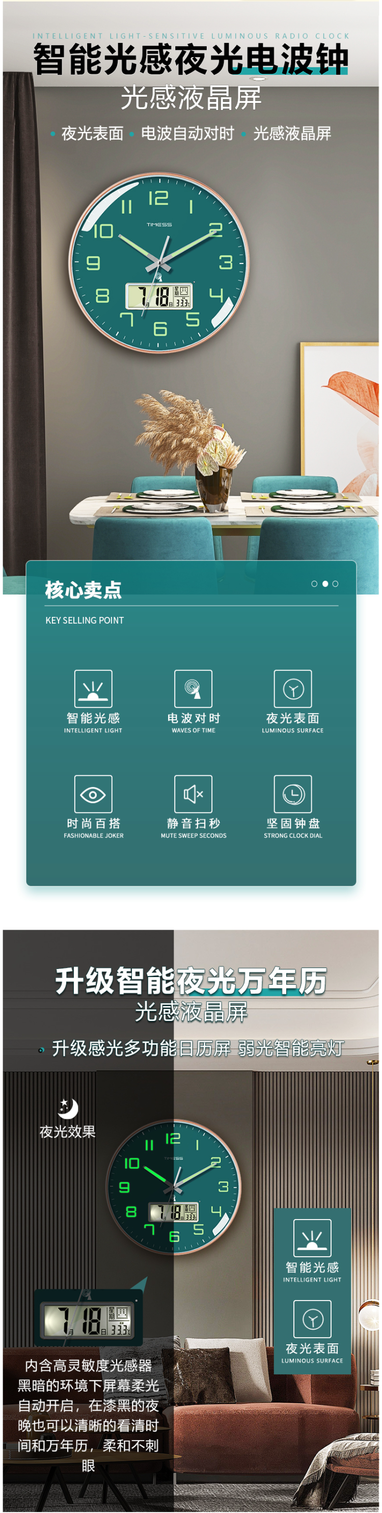 升级光感液晶屏,搭配高灵敏光感器,在黑暗的环境下屏幕柔光自动开启,在漆黑的夜里也能看清时间和万年历。能显示日期、星期、农历、温度。静音扫描机芯,走时无声不扰人。