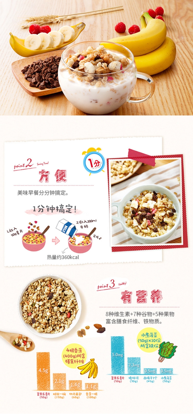 这款含有草莓干、苹果干、木瓜干、葡萄干、南瓜子、大杏仁、椰子、燕麦、黑麦粉、糙米粉、麦麸、玉米粉等,丰富口感,富含膳食纤维、维生素和铁物质。