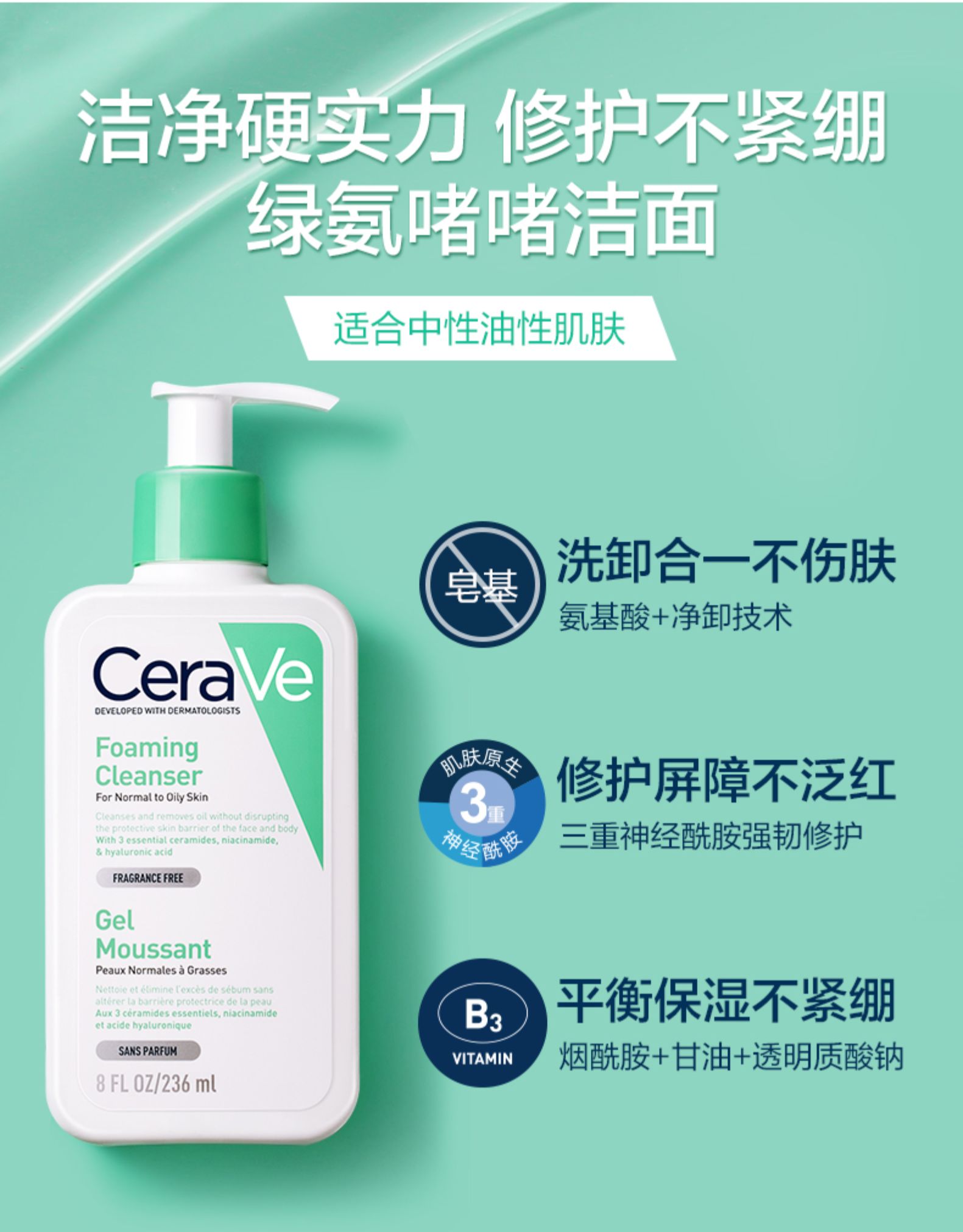 这款氨基酸泡沫洗面奶,清爽无皂基,乳液质地无泡温和,特别适合敏感肌和屏障受损的肌肤,洗后干净不干燥。水油平衡,帮助控油祛痘,清洁补水保湿,男女都能用。