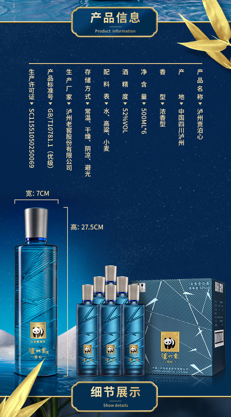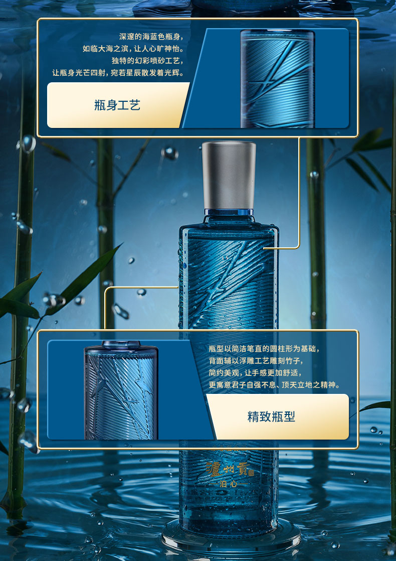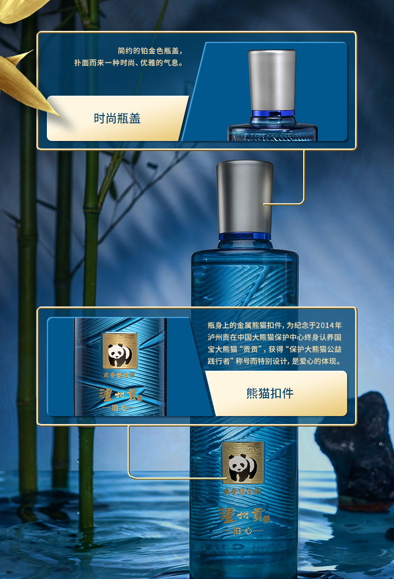 这款泸州贡 泊心,52度浓香型,高度不刺激,口感醇厚柔和,回味悠长、饮后尤香。深邃的海蓝色瓶身,独特的幻彩喷砂工艺,让瓶身光芒四射,瓶身上的金属熊猫扣件,为纪念于2014年泸州贡在中国大熊猫保护中心终身认养国宝大熊猫“贡贡”,获得“保护大熊猫公益践行者”称号而特别设计,匠心独具,高端大气,送礼更有面子。