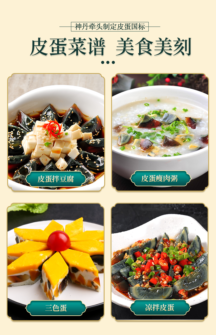 手工秘制,无铅工艺,操作简单,品质口感极佳,营养美味,色泽完美,层次分明。溏心皮蛋包泥疏松,色浅,易剥落。天气渐热,皮蛋非常适合凉拌做凉菜等,美味爽口,下酒好菜,还可以煮皮蛋瘦肉粥等,别有风味。
