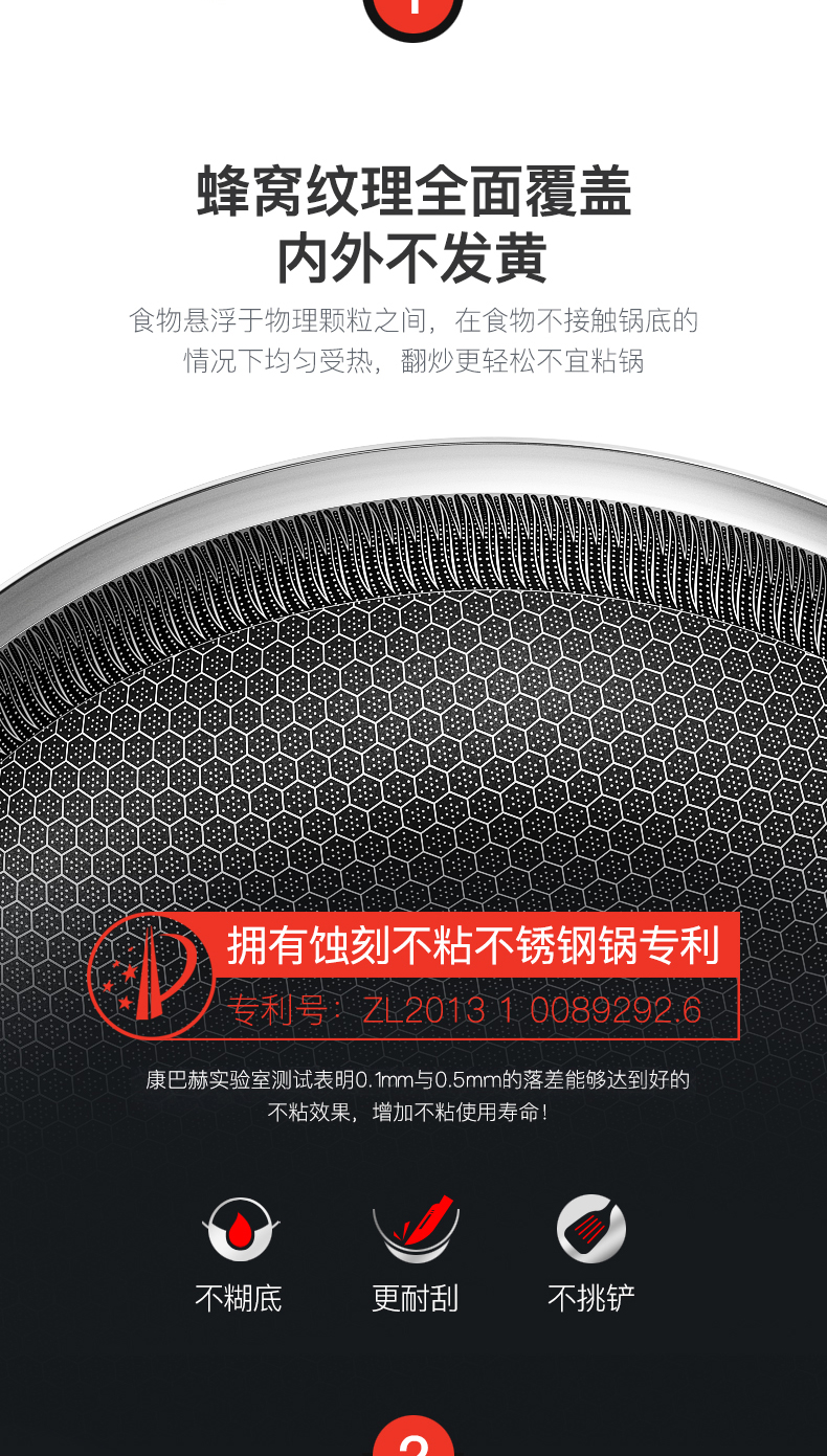 这款康巴赫不粘锅,采用比304不锈钢性能更加稳定的医用级316不锈钢,包括316不锈钢在内,共五层压铸而成。其中,内里采用高精微刻技术和蜂窝纹理全面覆盖,拥有国家发明专利技术,大幅度提高不粘特性,且少油烟。