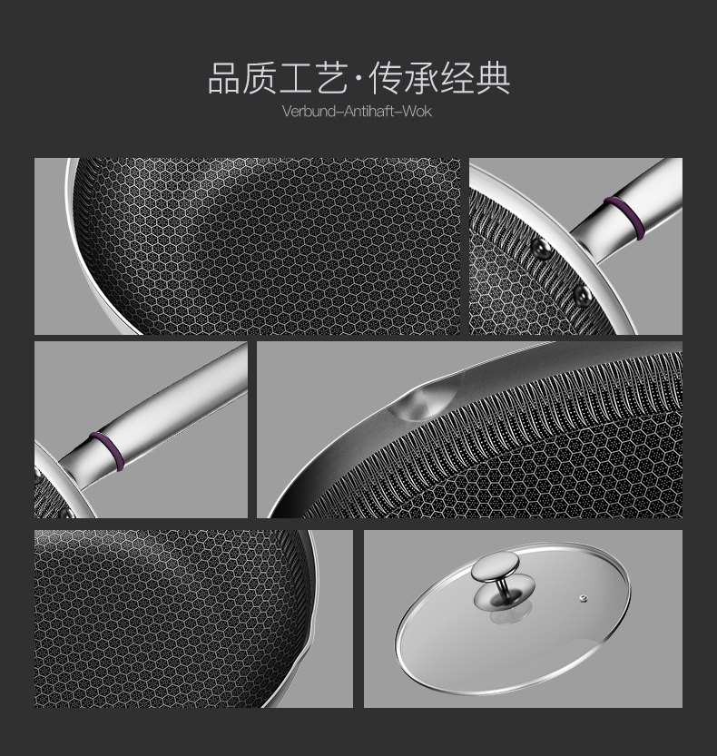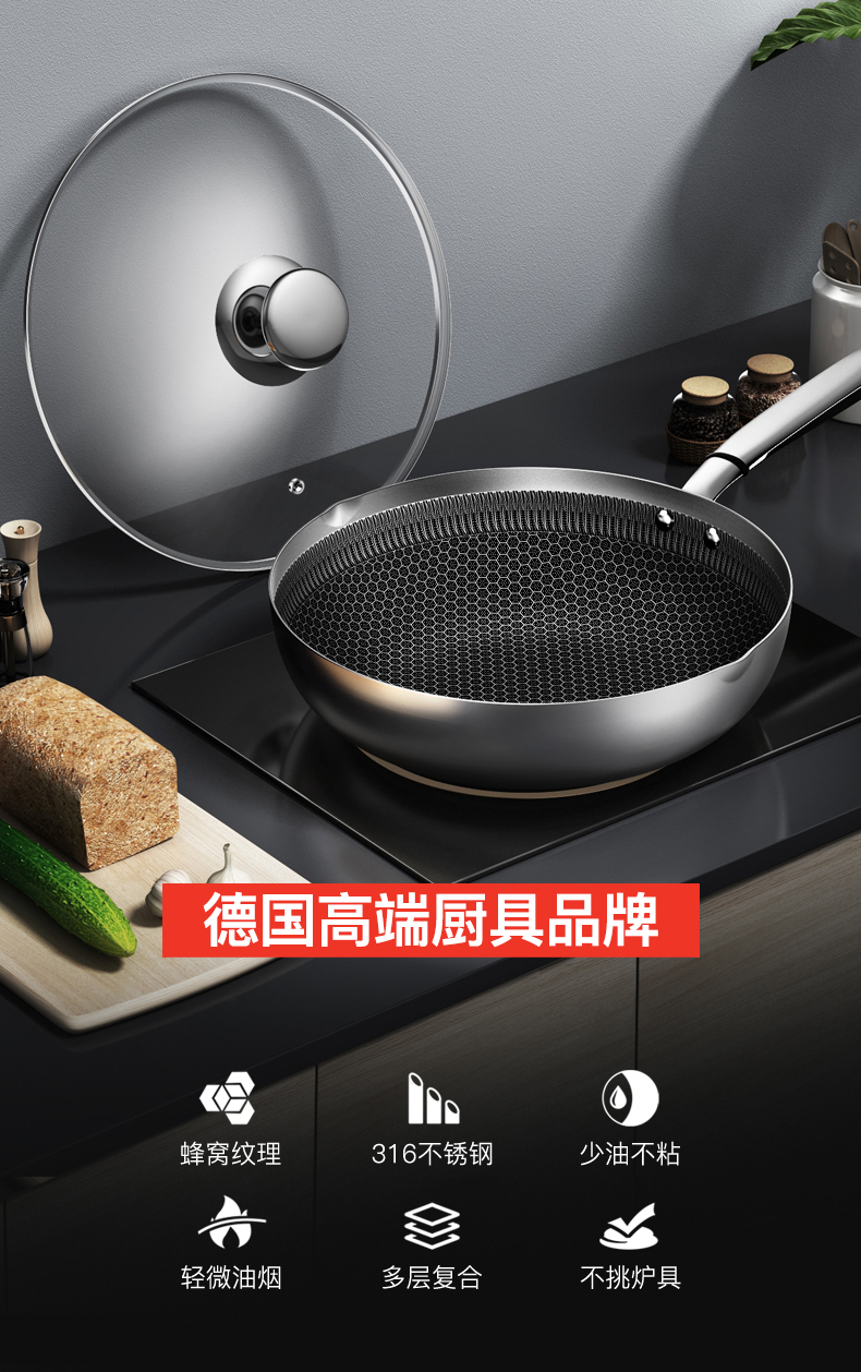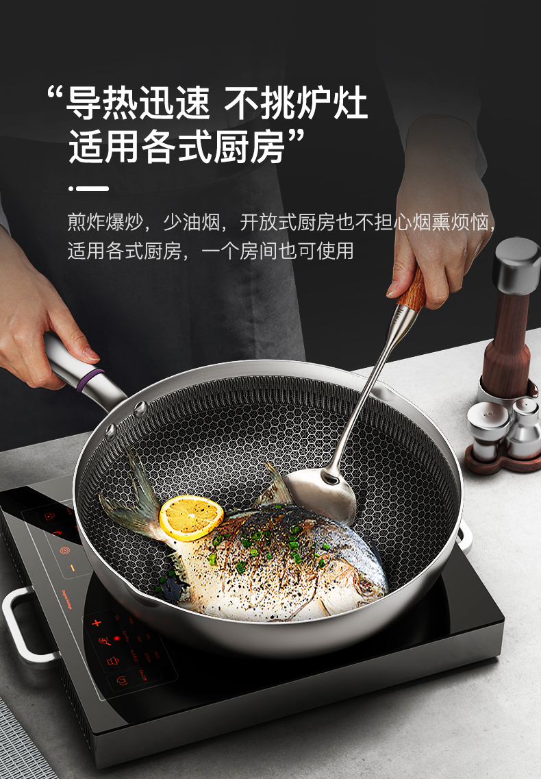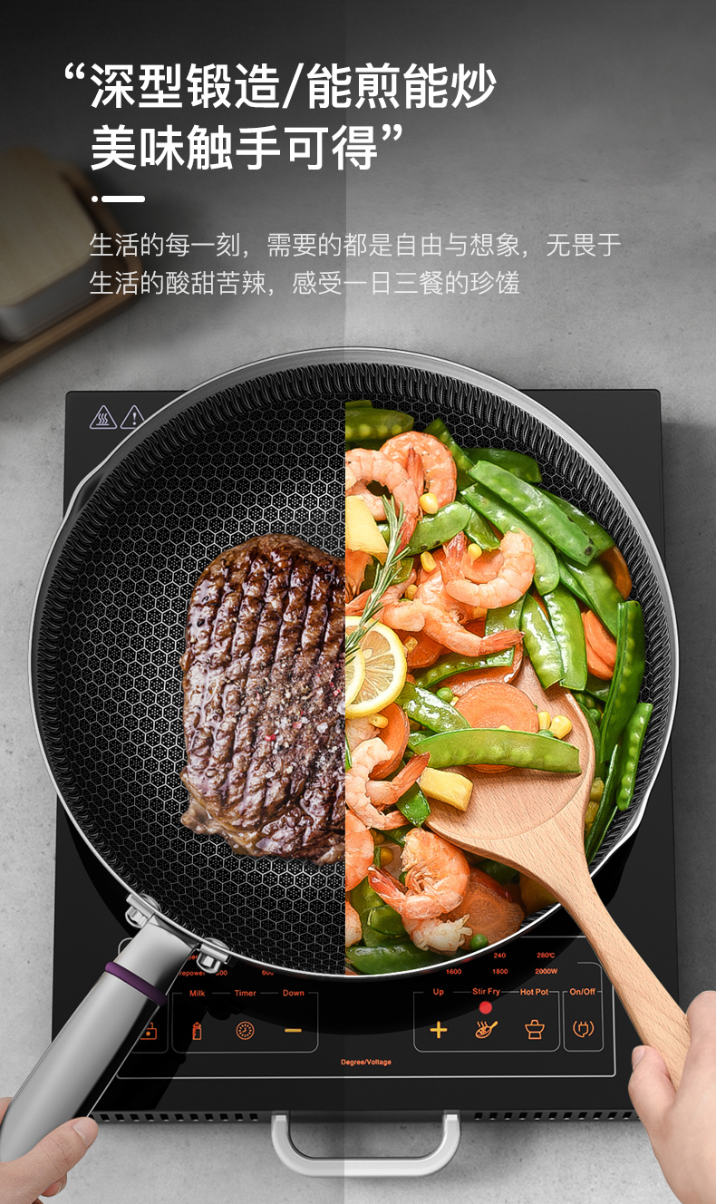 内层蜂窝纹理和精雕技术,不怕剐蹭,锅底不发黄,一擦即净,方便清理。锅底为双层储能基材,升温迅速且均匀,不挑炉灶,燃气灶、电磁炉等都适用。9.5cm锅深设计,煎炒蒸煮都能实现。把手与锅身为加固铆钉,坚固耐用。