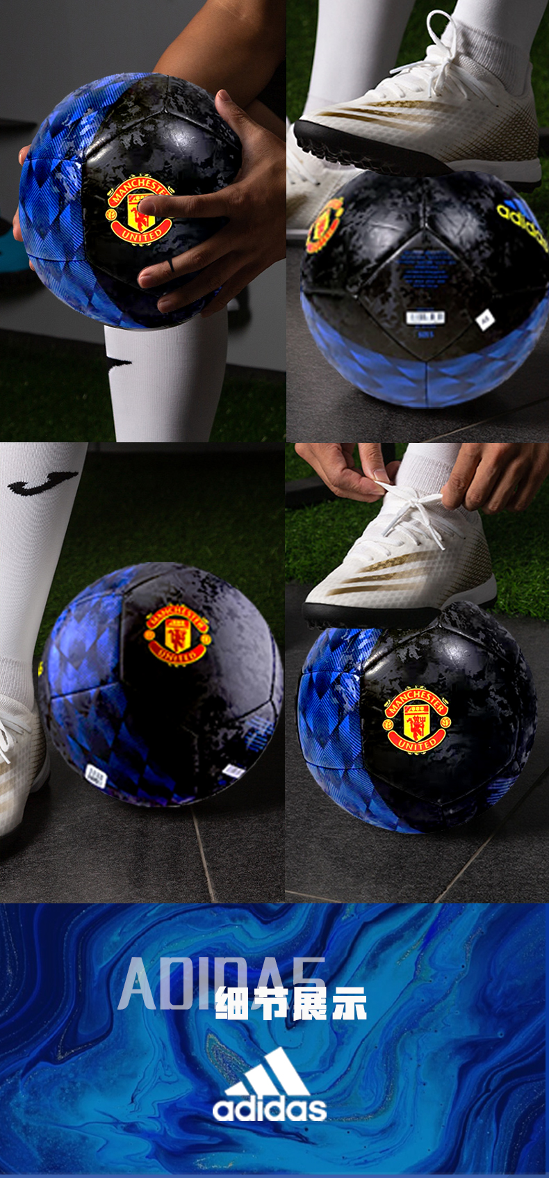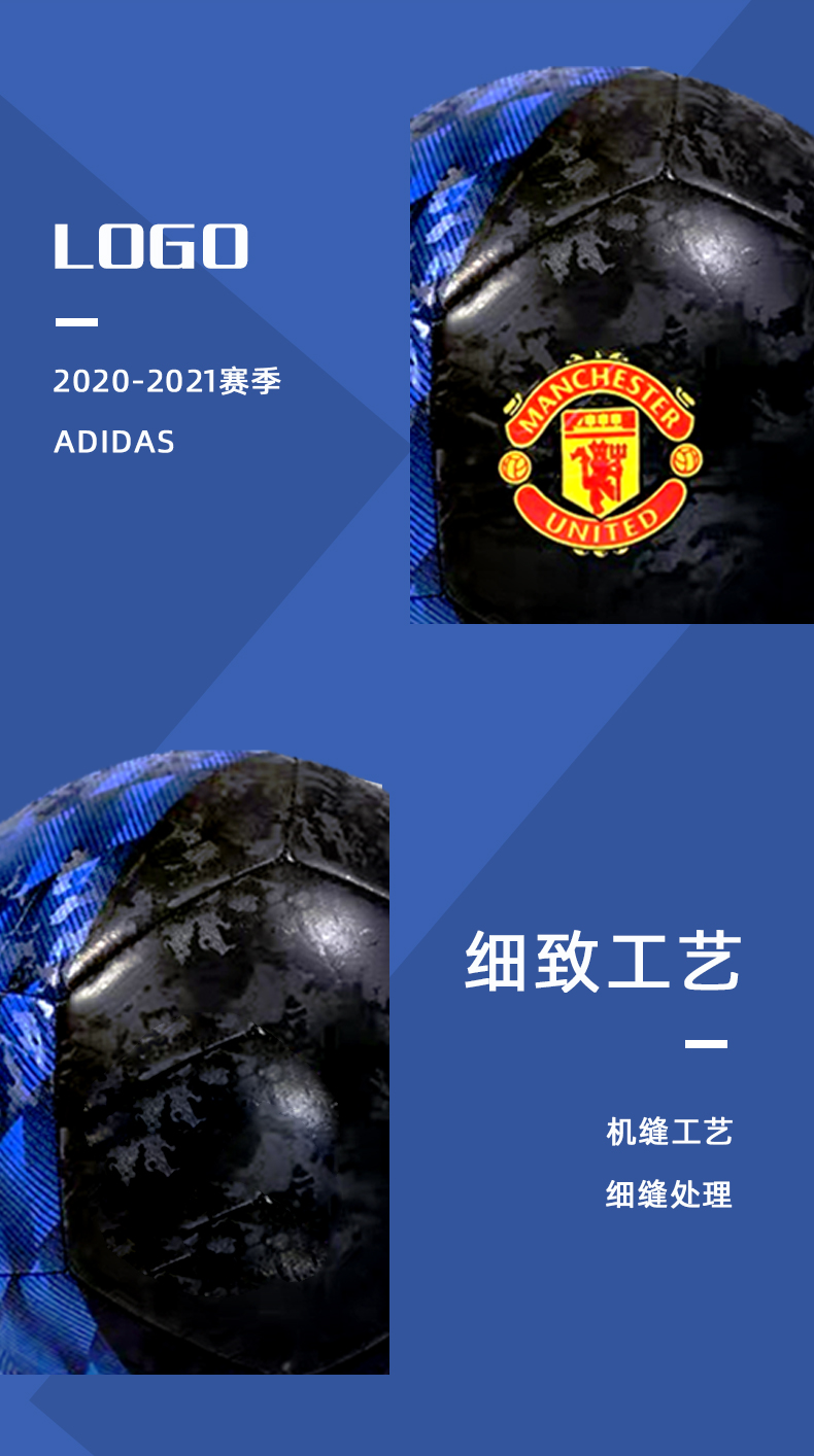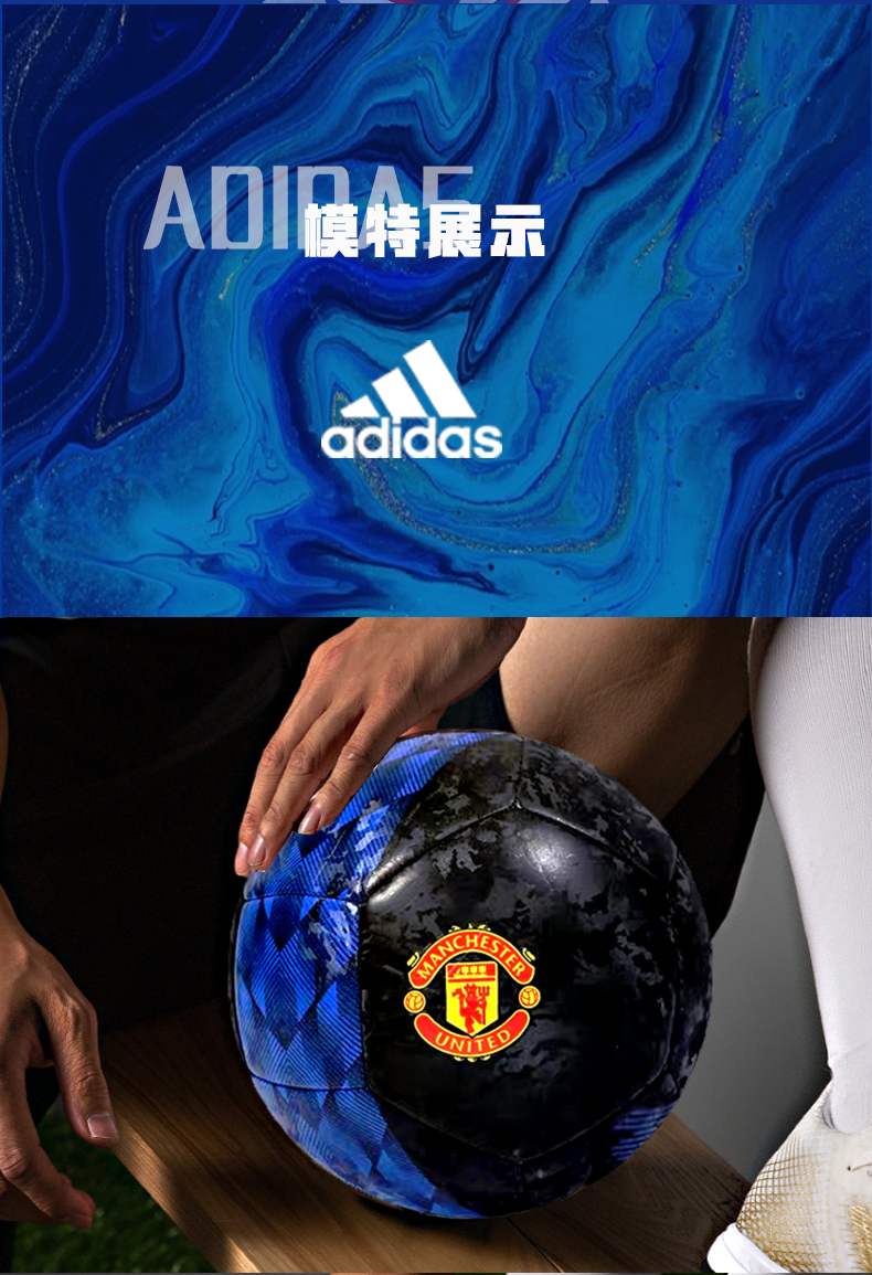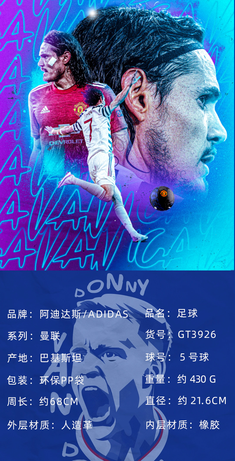 这款阿迪达斯Adidas的足球,是印有曼联Logo的限量纪念版,标准5号球, 重430g、直径约21.6cm、内层橡胶外层人造革,填充加厚POE新型泡棉,细腻机缝不露线。