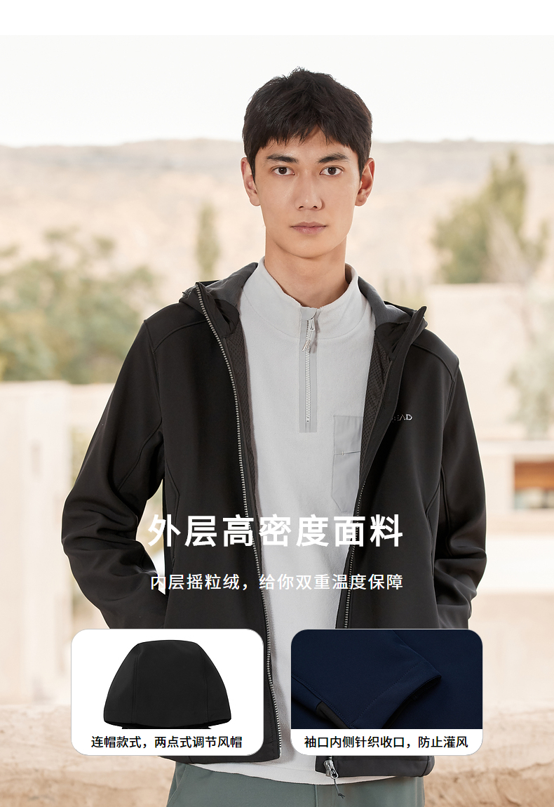 这款这款 软壳外套,属于探路者的Trekking徒步系列,表层面料采用的是310克重的聚酯纤维弹力复合科技面料,内里附着一层优质的摇粒绒,具有非常好防风、透气、保暖的功能,短时间防小雨,表面抗污,可保持颜色持久如新。