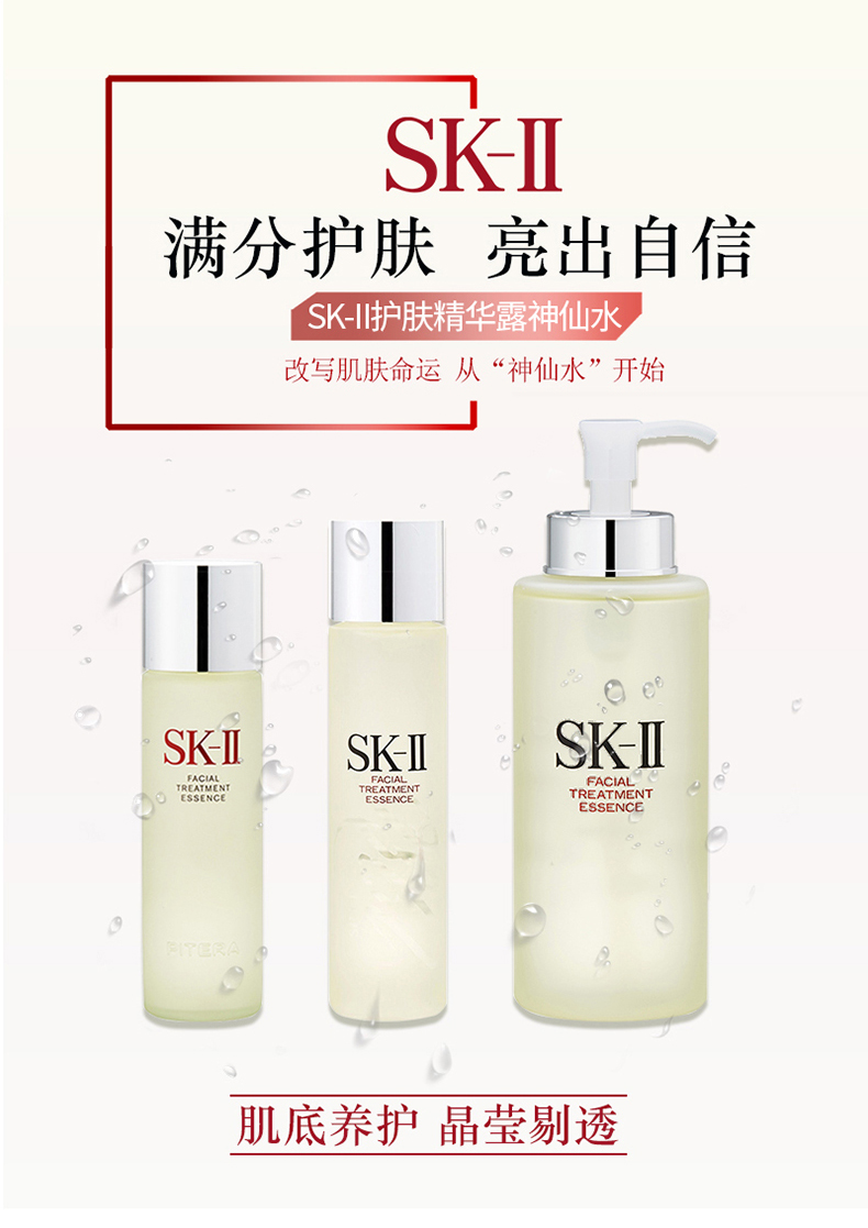 SK-II神仙水含有高达90%以上的富含多种营养成分的PiteraTM酵母精华。每天为肌肤提供充足营养并调理肌肤,深层保湿,平衡肌肤的pH值,塑造润泽光洁的肌肤本色。 PiteraTM提升五大美肌维度,让肌肤升华至晶莹剔透: