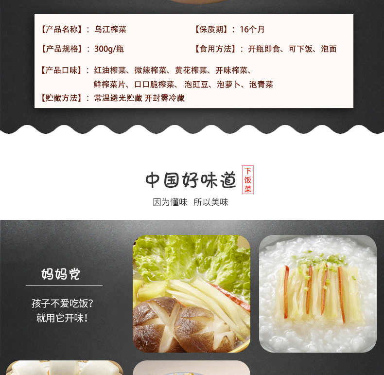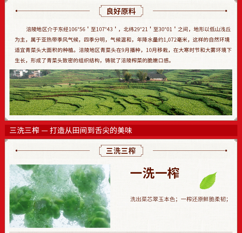 源自中国泡菜城---四川眉山,精选优质榨菜,配以香辣红油精心泡制而成,不含防腐剂,酸爽开胃,鲜香微辣,香辣脆爽,香味醇厚,用来下饭或当佐餐小菜都不错。