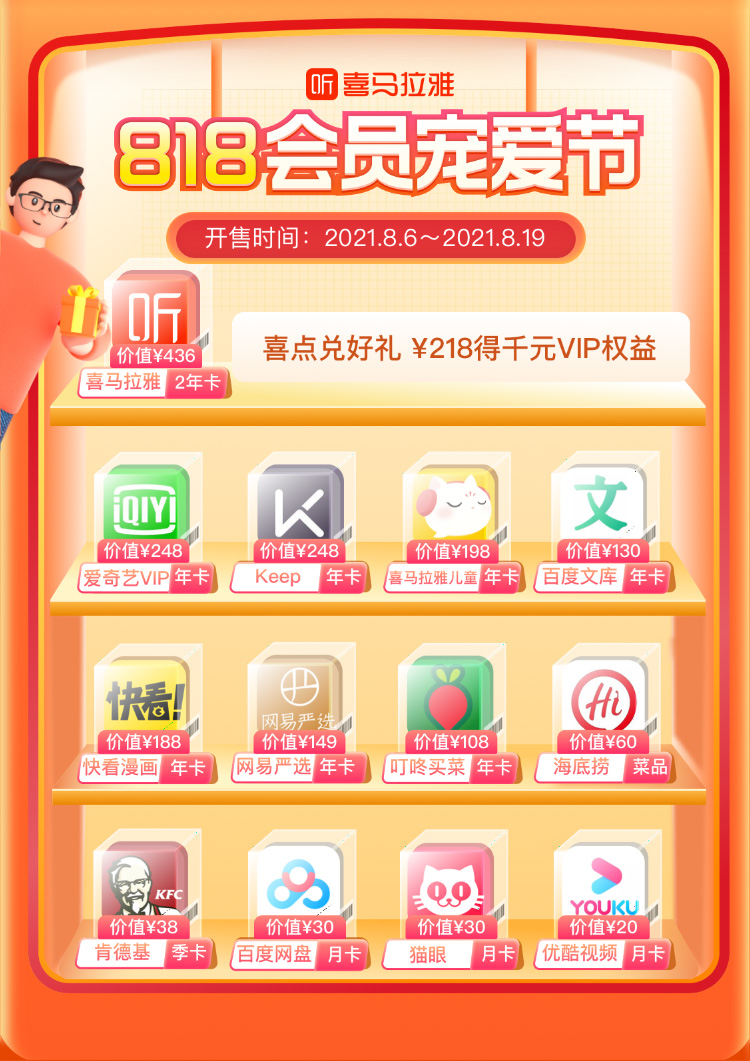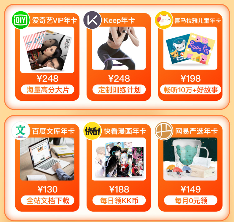 年卡会员(8家):喜马拉雅巅峰会员2年卡;爱奇艺黄金VIP年卡;keep会员年卡;喜马拉雅儿童会员年卡;百度文库会员年卡;网易严选pro会员年卡;快看漫画会员年卡;叮咚买菜会员年卡;