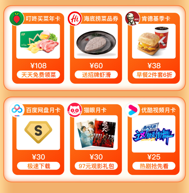 季卡&月卡会员(4家):肯德基大神卡季卡;优酷视频VIP月卡;猫眼会员月卡;百度网盘超级会员月卡;
