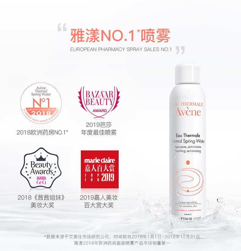 雅漾的大喷,直接从泉源取水,含肌肤所需的微量元素和二氧化硅,低矿物含量,帮助增强肌肤耐受性,降低敏感度。成人、儿童和婴儿均可使用。
