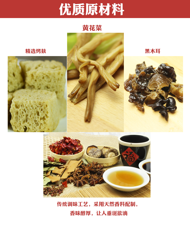四喜烤麸通常将烤麸、金针菜、木耳、花生米洗净了过油炒,成菜后香香甜甜。烤麸发得好的话,嚼起来会略有弹性,有浓重的酱汁从孔里渗出来,回味无穷。