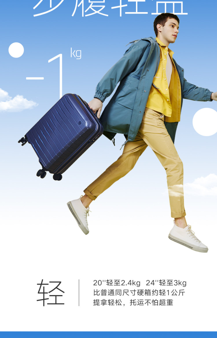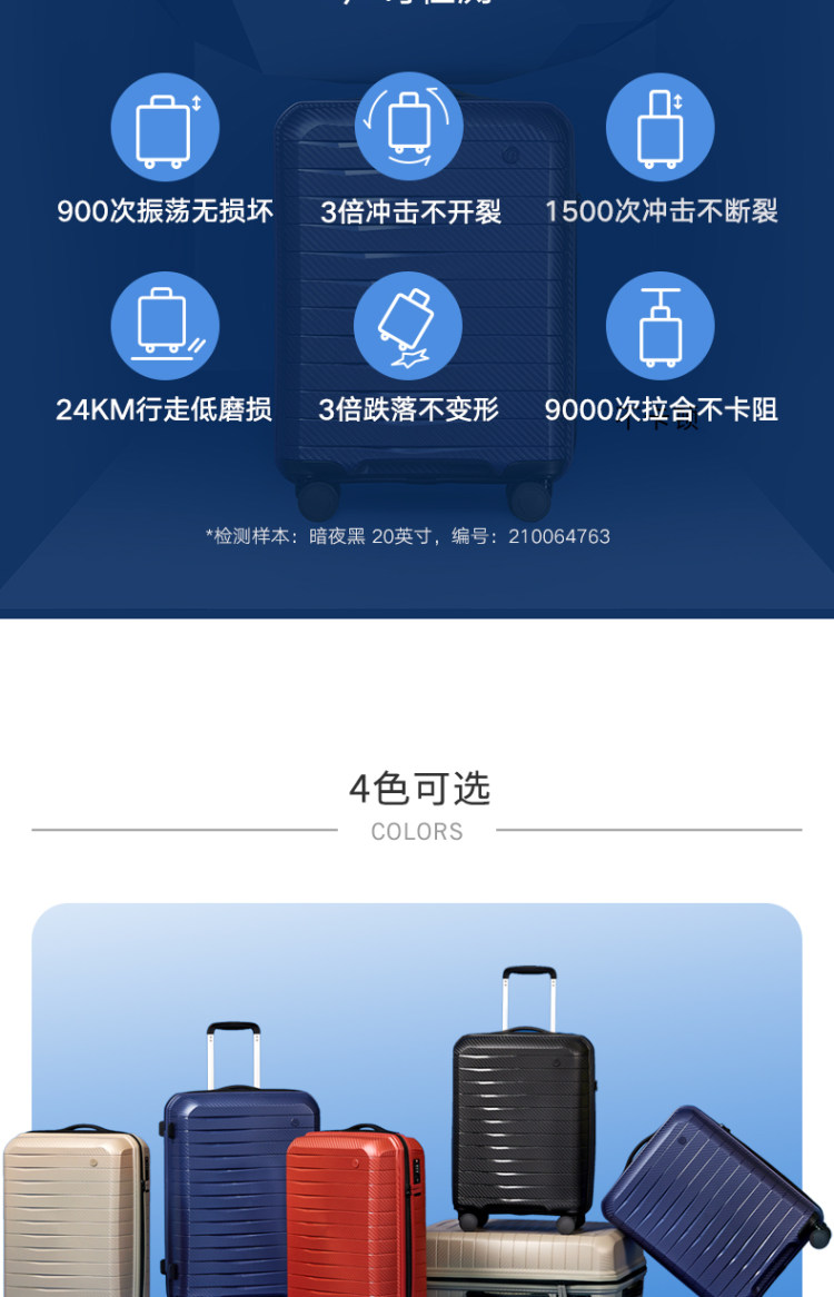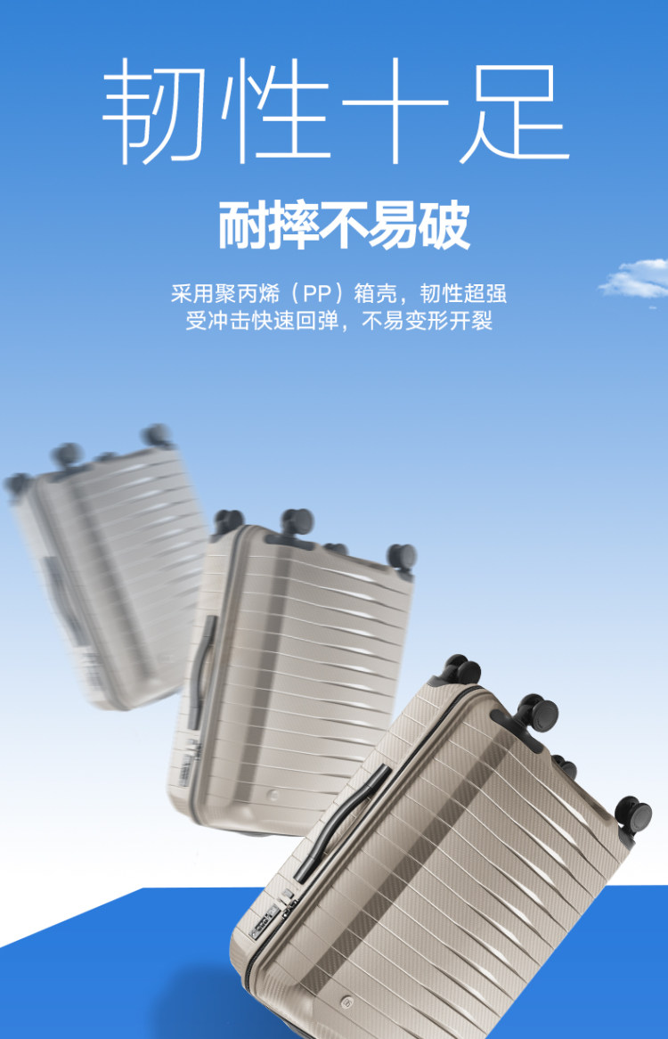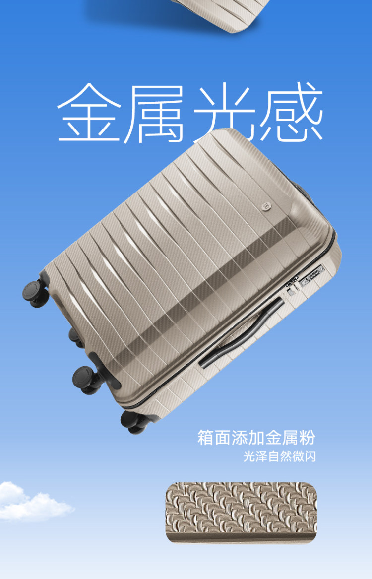 采用德国科思创PC材质(原 德国拜耳),将防刮层、增韧层、辅助层,三层PC同步热压,一体成型,赋予箱体超韧耐磨的力量,色泽细腻,久用如新。采用HINOMOTO日乃本万向轮,双轮结构,外层TPE材质,旋转灵活,减震耐磨,出行几乎无噪音,长久顺滑。U型整洁收纳袋设计,一侧网格可视,查找便捷,一侧不透明收纳袋,方便存放隐私物品,上层拉链袋笔记本电脑,满足差旅出行需求。