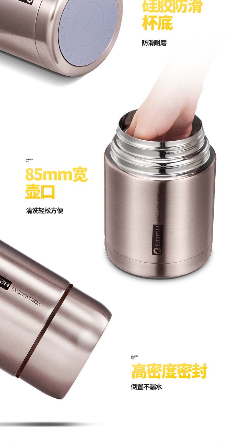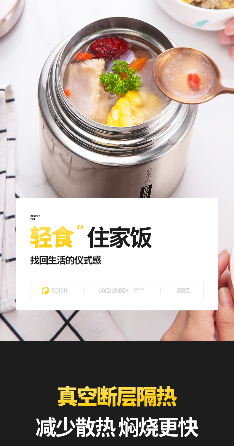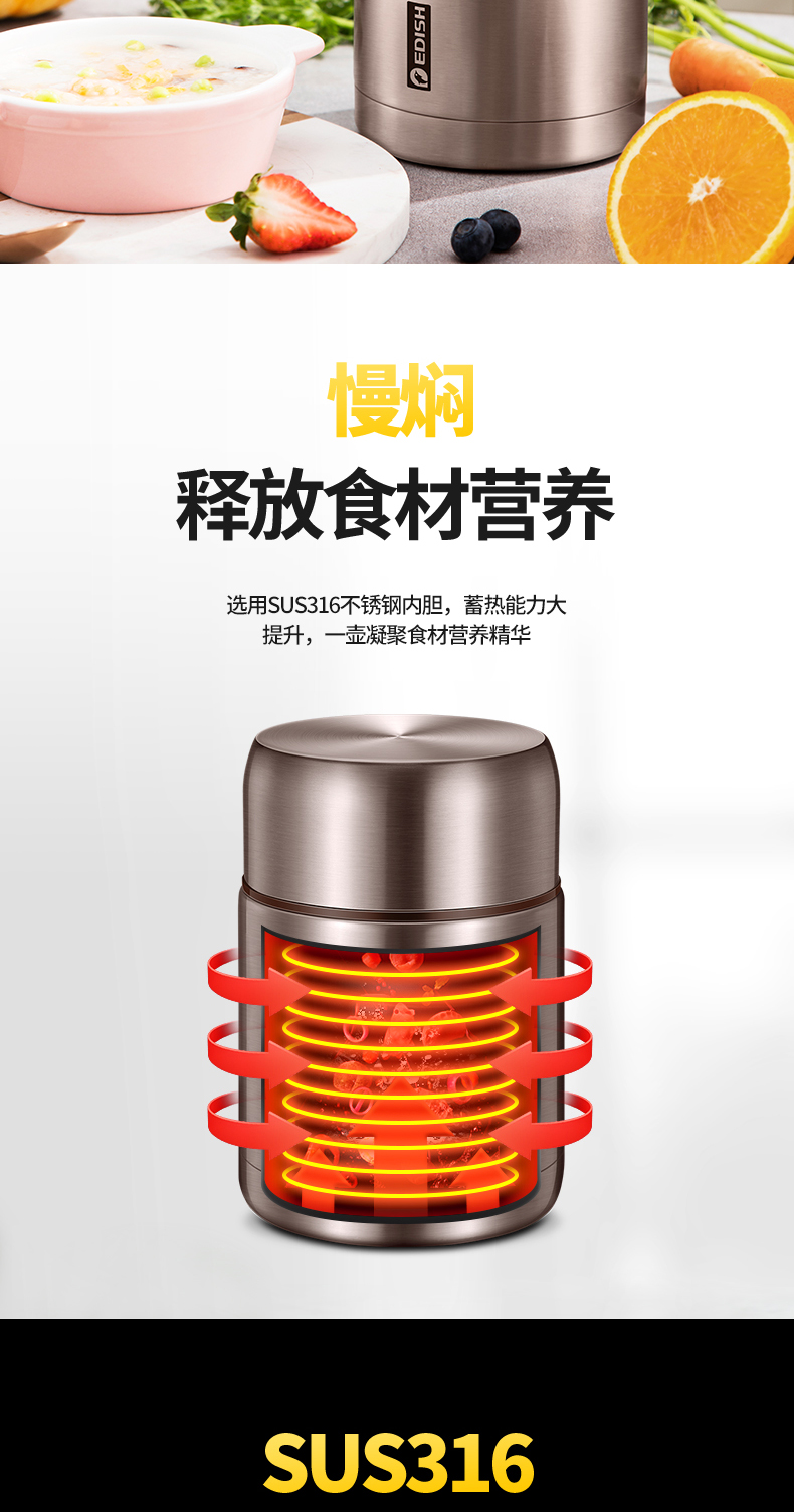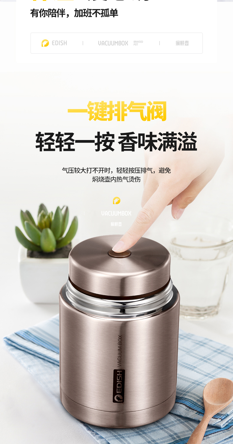这款壹滴水316不锈钢 焖烧杯,内里是316不锈钢,是医用级和军用级不锈钢,防生锈、耐磨、光亮,健康无毒;双层抽真空隔热技术,保温保冷,安全防漏,内盖带排气阀,气压大打不开时,可轻按排气阀,平衡气压;