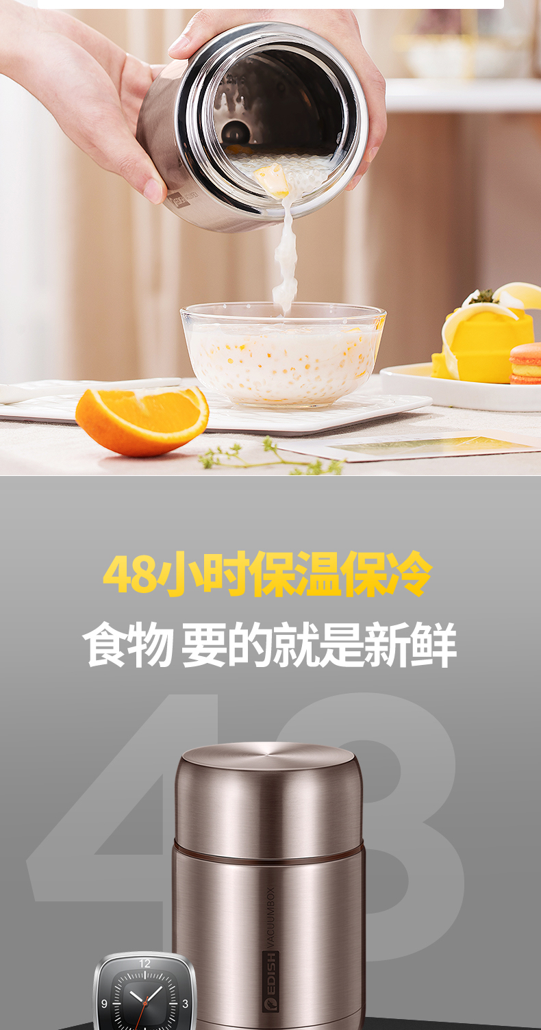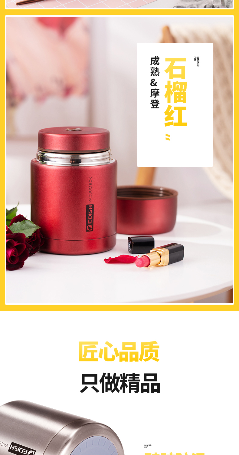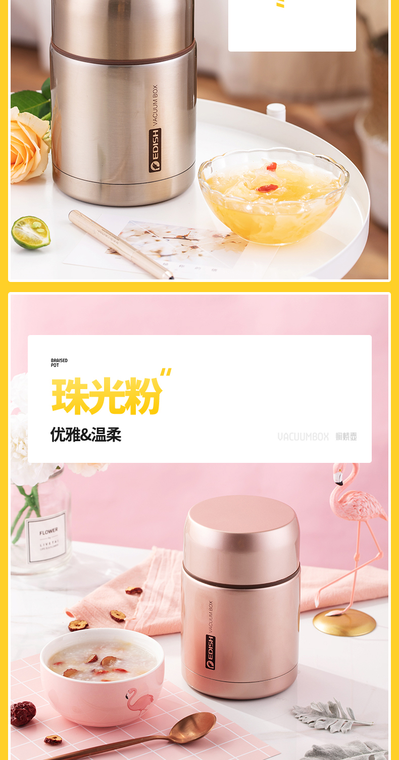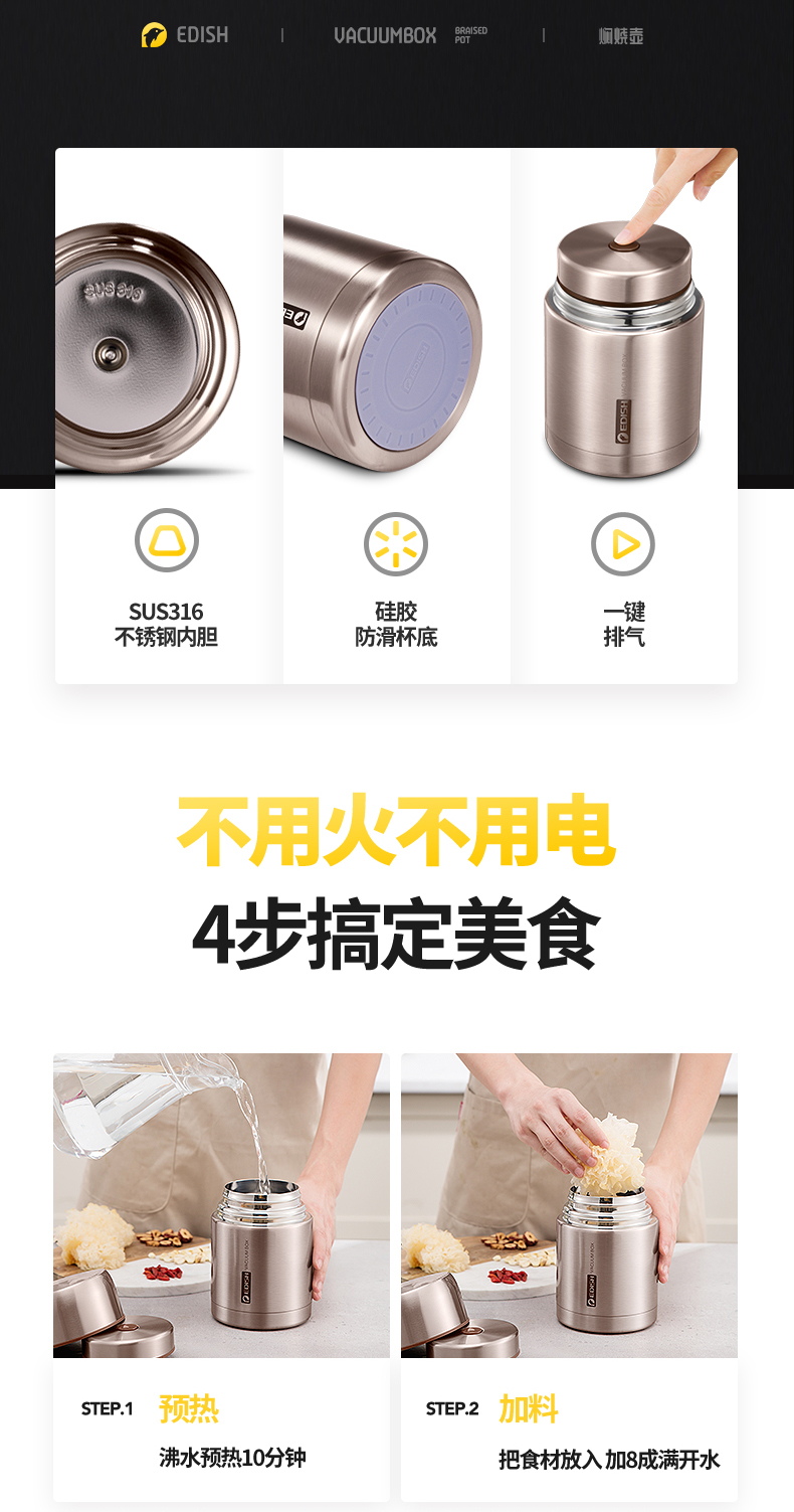 这款壹滴水316不锈钢 焖烧杯,内里是316不锈钢,是医用级和军用级不锈钢,防生锈、耐磨、光亮,健康无毒;双层抽真空隔热技术,保温保冷,安全防漏,内盖带排气阀,气压大打不开时,可轻按排气阀,平衡气压;