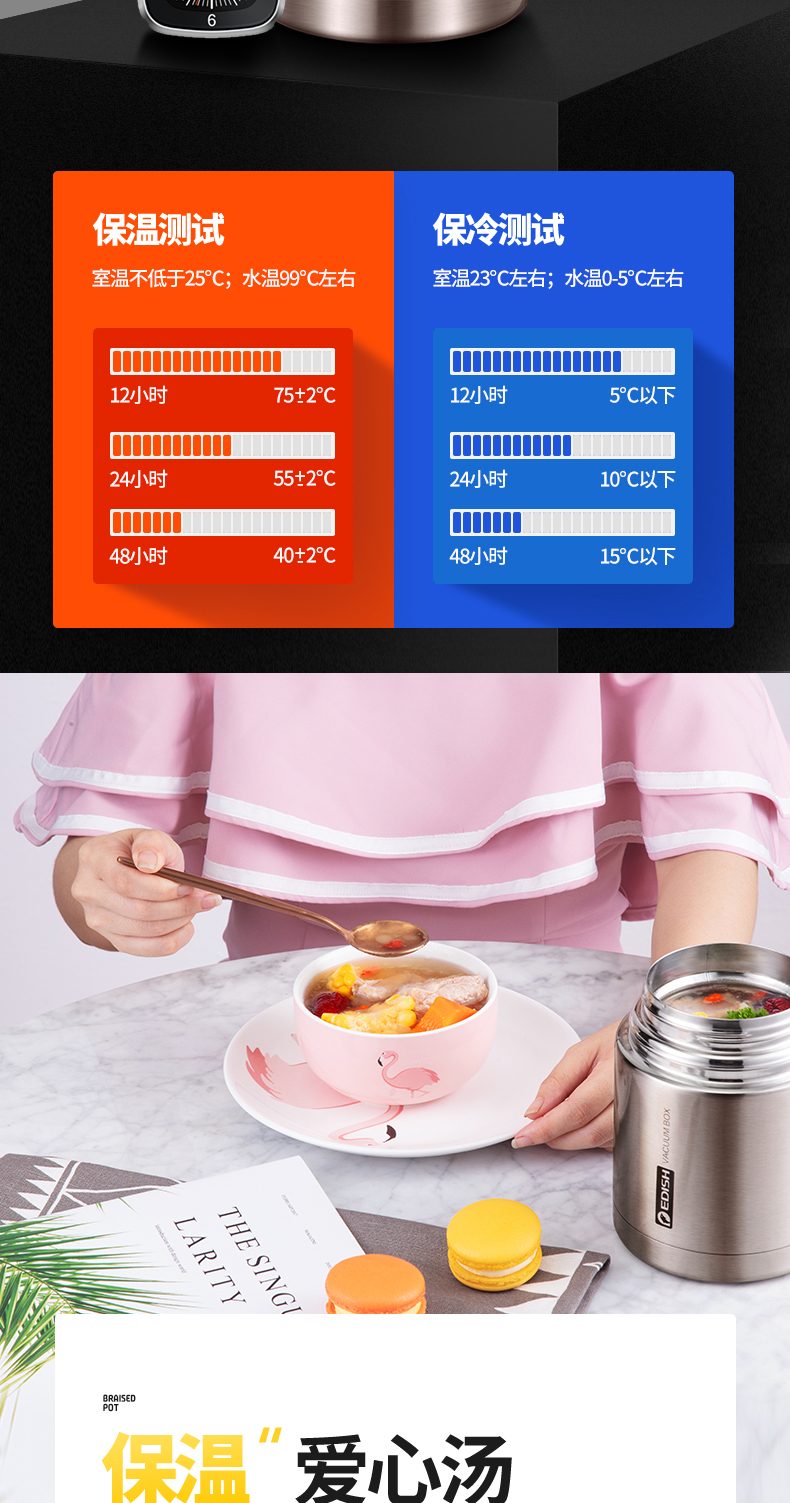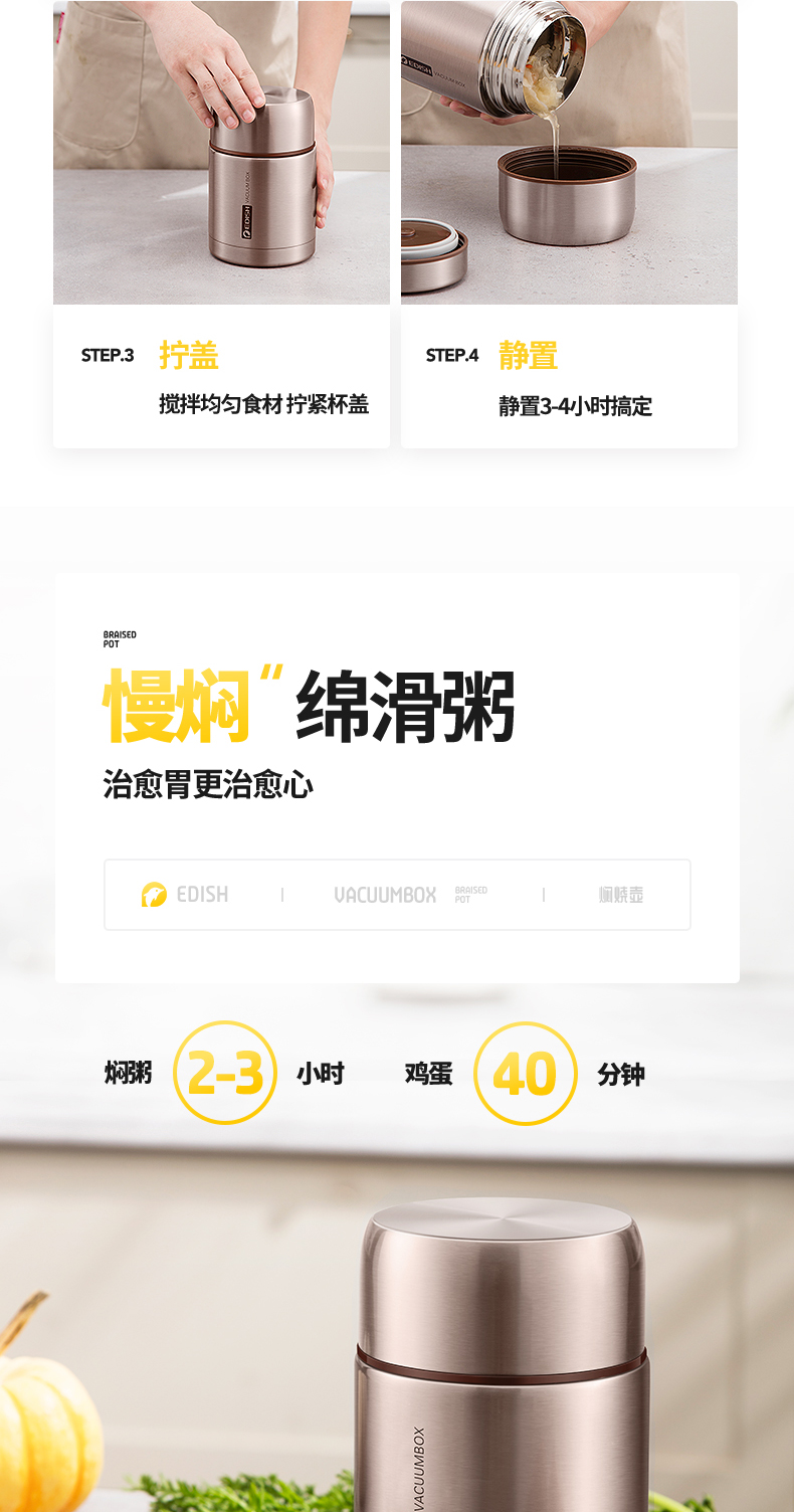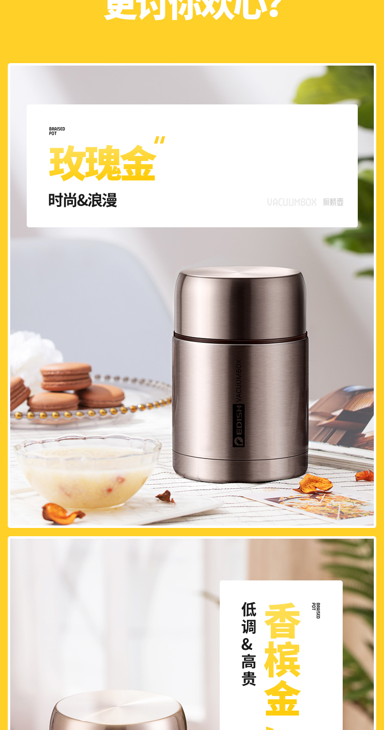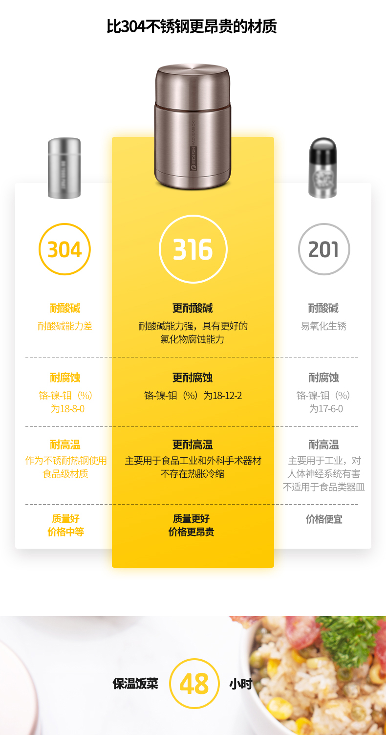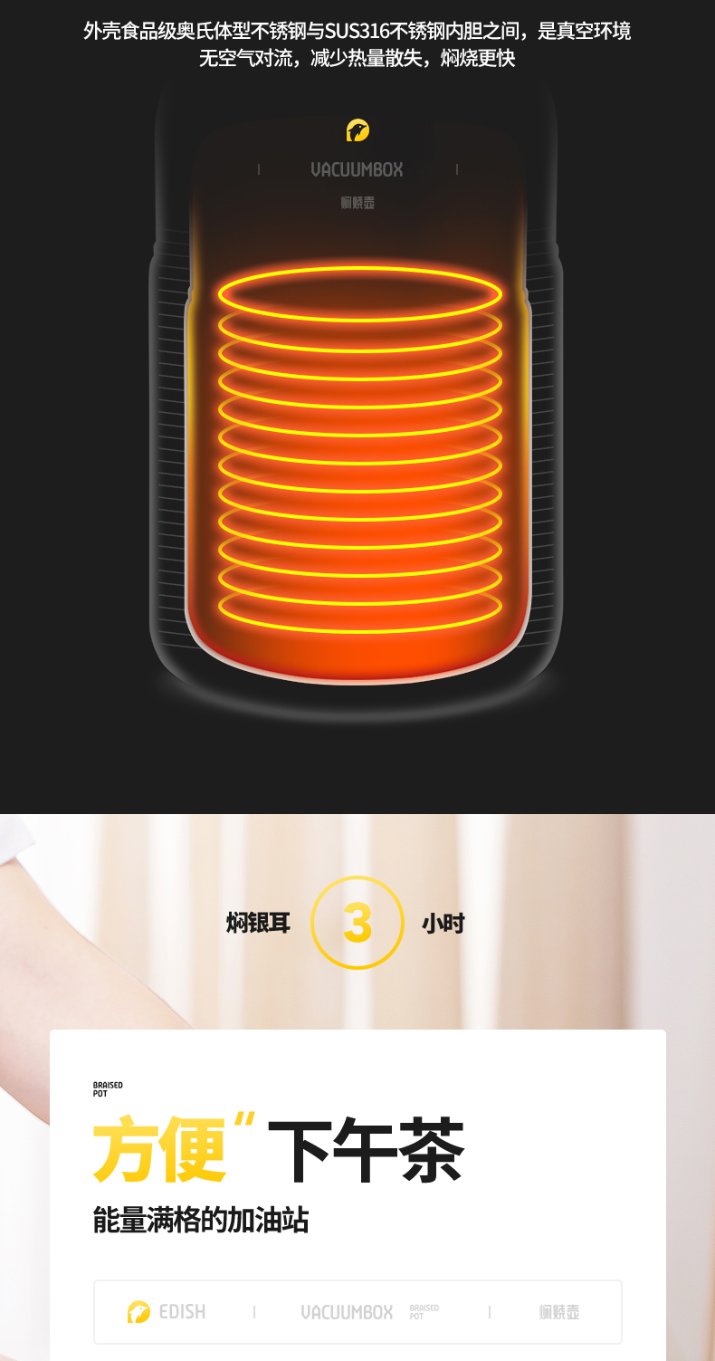 这款壹滴水316不锈钢 焖烧杯,内里是316不锈钢,是医用级和军用级不锈钢,防生锈、耐磨、光亮,健康无毒;双层抽真空隔热技术,保温保冷,安全防漏,内盖带排气阀,气压大打不开时,可轻按排气阀,平衡气压;
