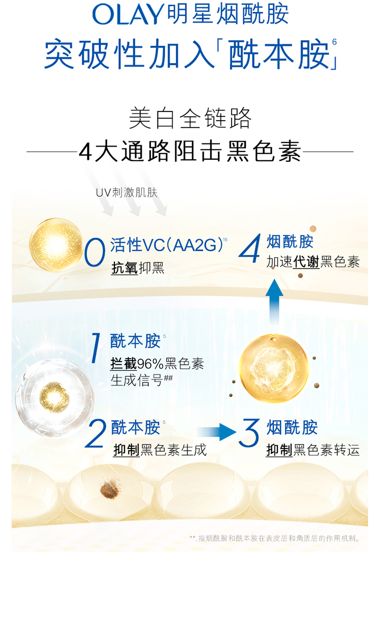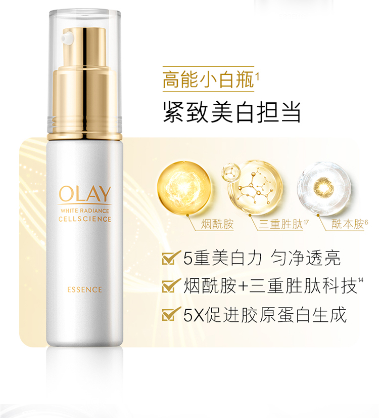 光感小白瓶主打5%高浓度的烟酰胺成分,配合十一碳烯酰基苯丙氨酸、抗坏血酸葡糖苷等高效美白成分,可以帮助阻止黑色素形成,提亮肤色,加速胶原蛋白形成,使肌肤恢复自然亮泽,并保持丰盈弹性。