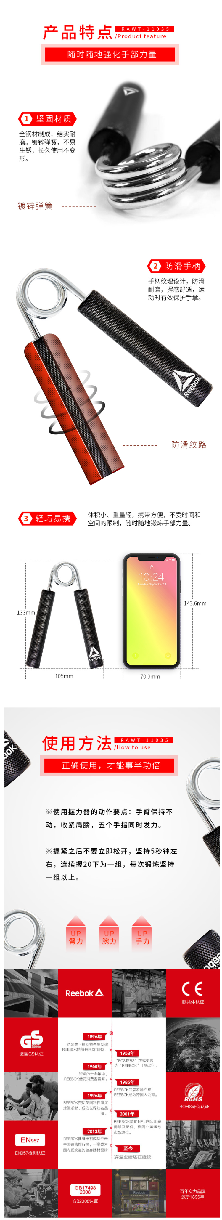 这款锐步专业握力器,主体是全钢材制成,结实耐磨。镀锌弹簧,不易生锈,长久使用不变形。手柄纹理设计,防滑耐磨,握感舒适,运动时有效保护手掌。