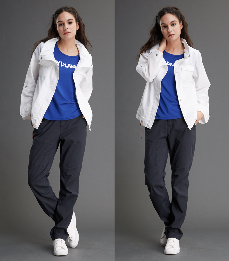 前胸拉链码带与牙齿撞色,细节处更显精致时尚。反射logo,夜间出行保障安全。魔术贴调节袖口。