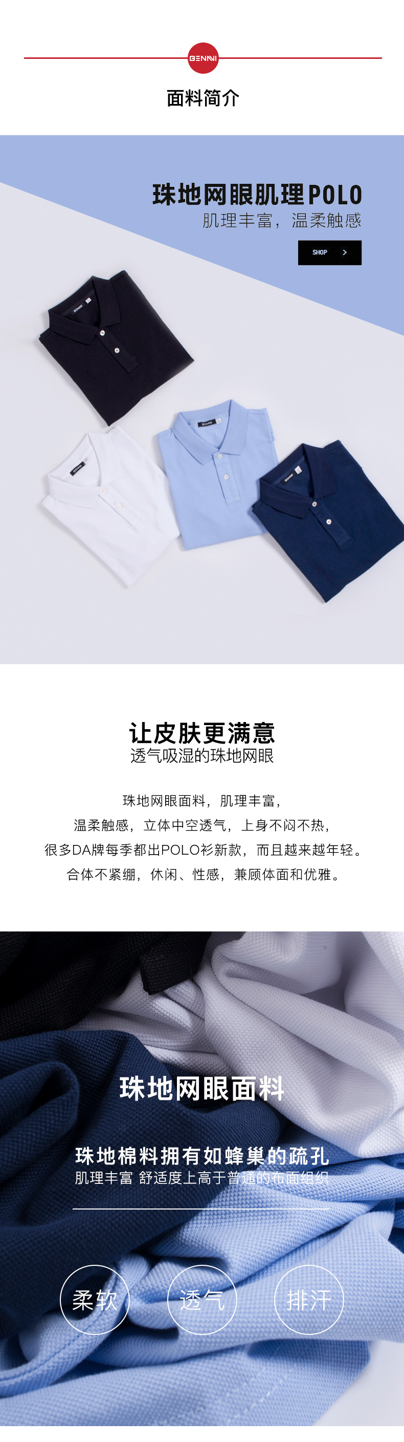 本米男士polo衫,面料为100%美国皮马棉,珠地网眼结构,比普通针织布更透气、透湿、干爽及更耐洗,夏天穿舒适又好打理。