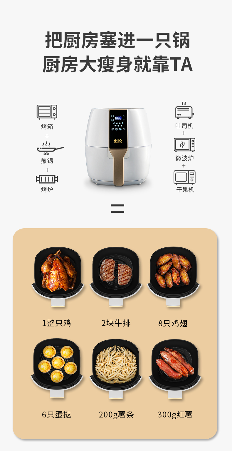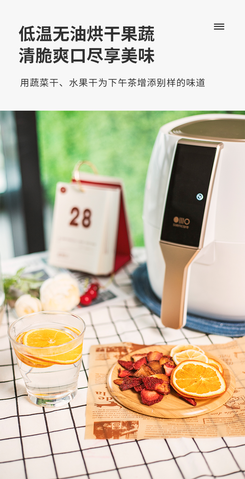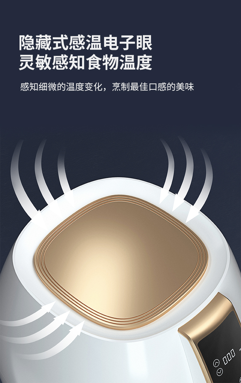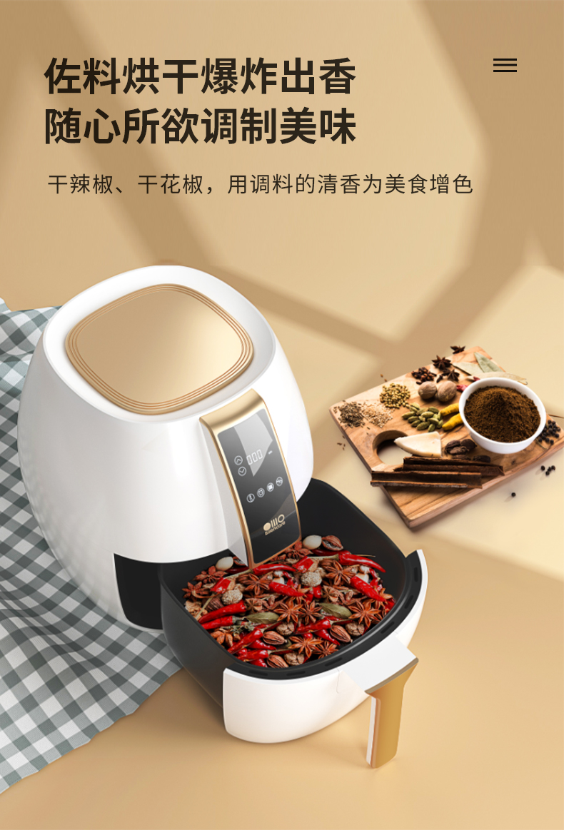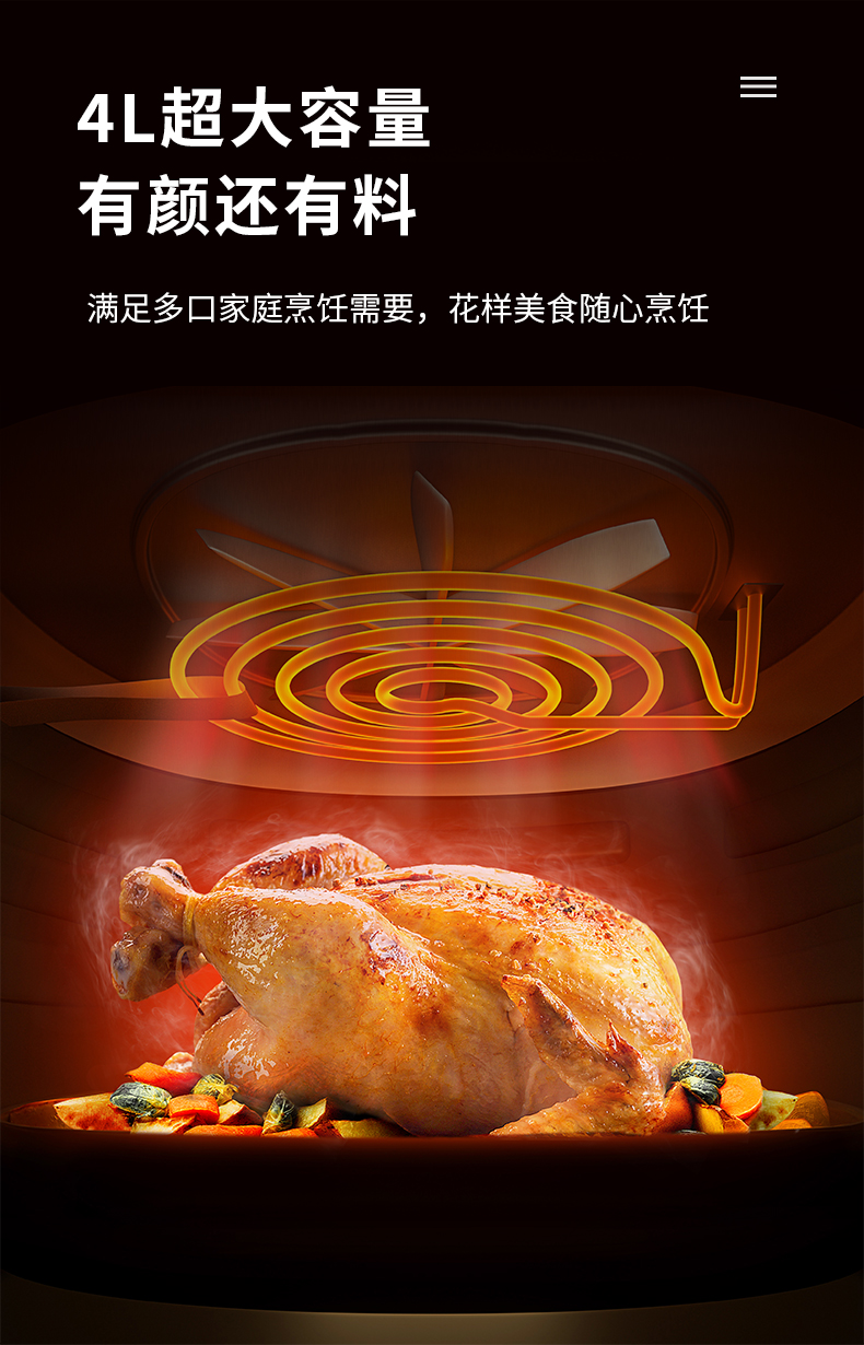 空气炸锅主要原理是热流在3D循环风扇的带动下,加速与食物的热交换,这样可以用高温空气代替热油,实现酥脆的口感。同时还能逼出食物中油脂,减少油脂摄入,相比油炸更健康。